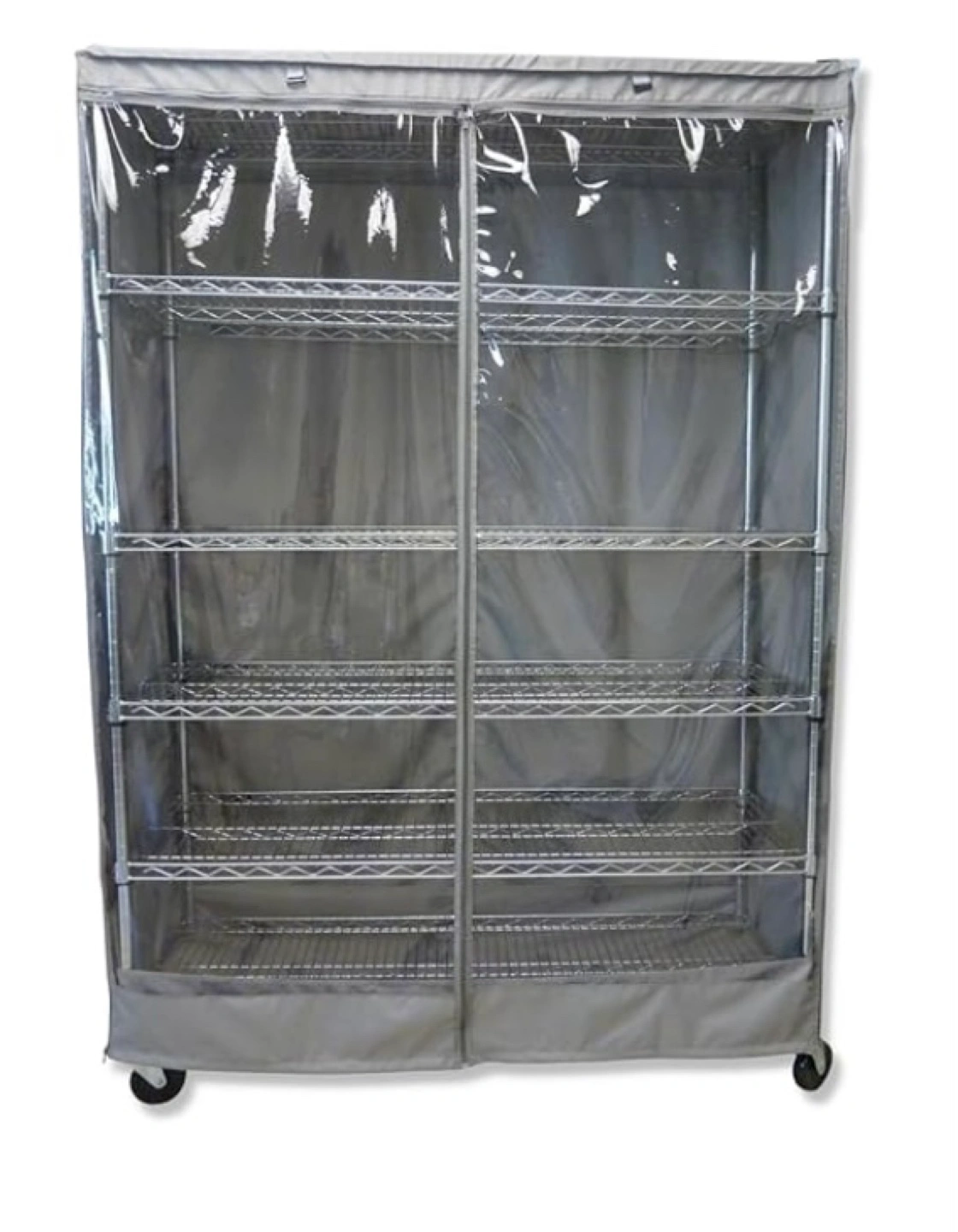 Heavy-duty rolling shelving unit. Features a fabric cover with clear vinyl panels. Unique T-zipper design. Two straps included to roll up the front or back panel. Measures 72"H x 48"W x 18"D.