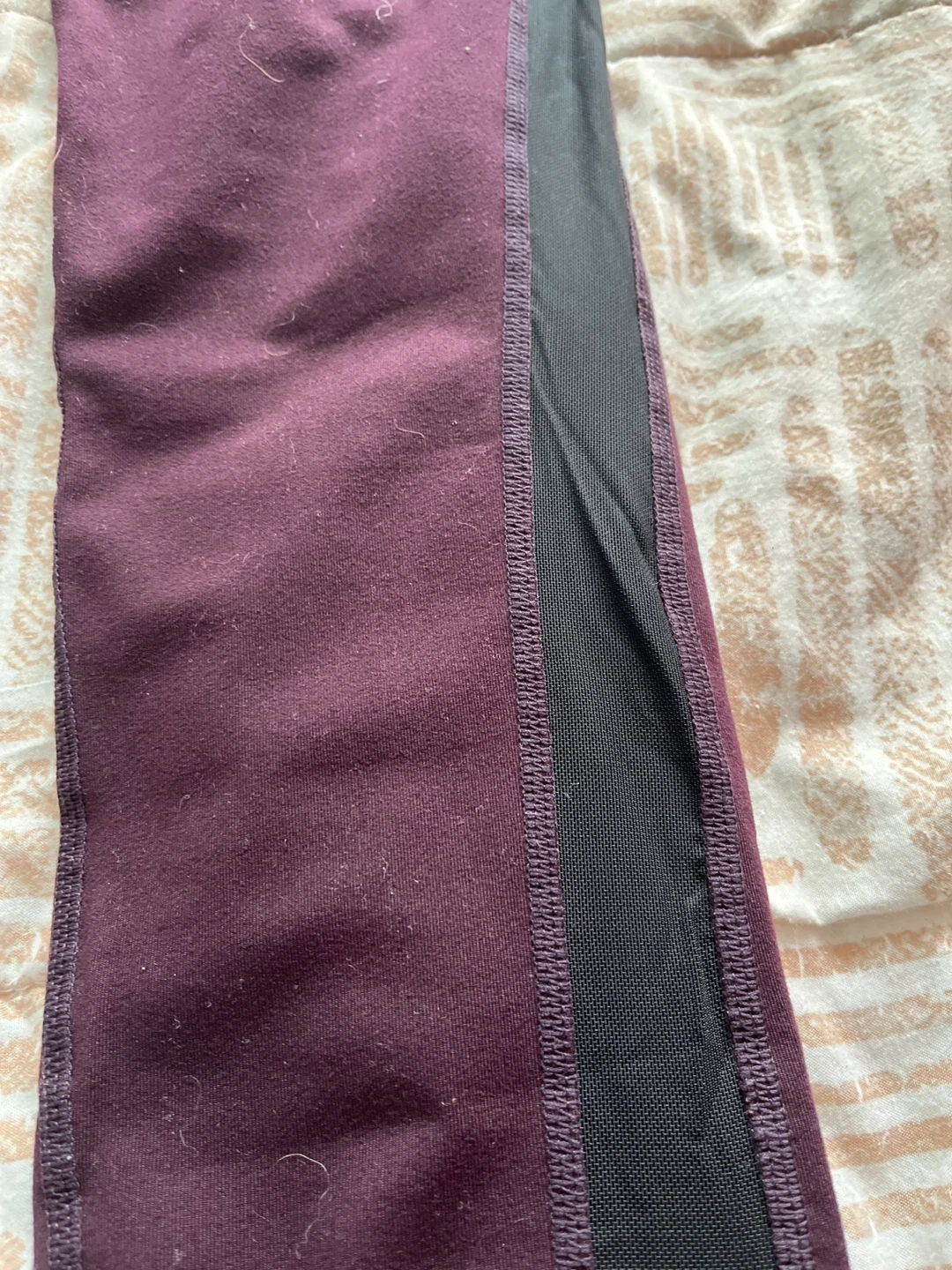 These GapFit leggings are a rich burgundy colour with black mesh paneling on the sides. They have a comfortable high-waisted fit. Perfect for workouts or casual wear!