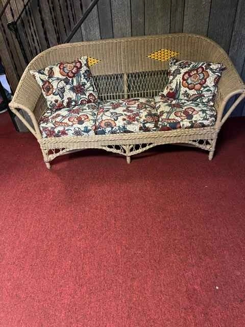 Vintage wicker patio furniture set includes a three-seat sofa, two matching armchairs, and a round coffee table. This charming collection features a classic woven natural fiber construction with decorative yellow diamond accents on the high curved backs. The seating comes with plush cushions and coordinating throw pillows in a vibrant floral pattern with shades of red, blue, and tan. Perfect for a sunroom, covered porch, or bohemian living space, this sturdy set offers a timeless cottage or coastal aesthetic. The coffee table features a matching braided edge detail. Pick up only in Franklin Square.