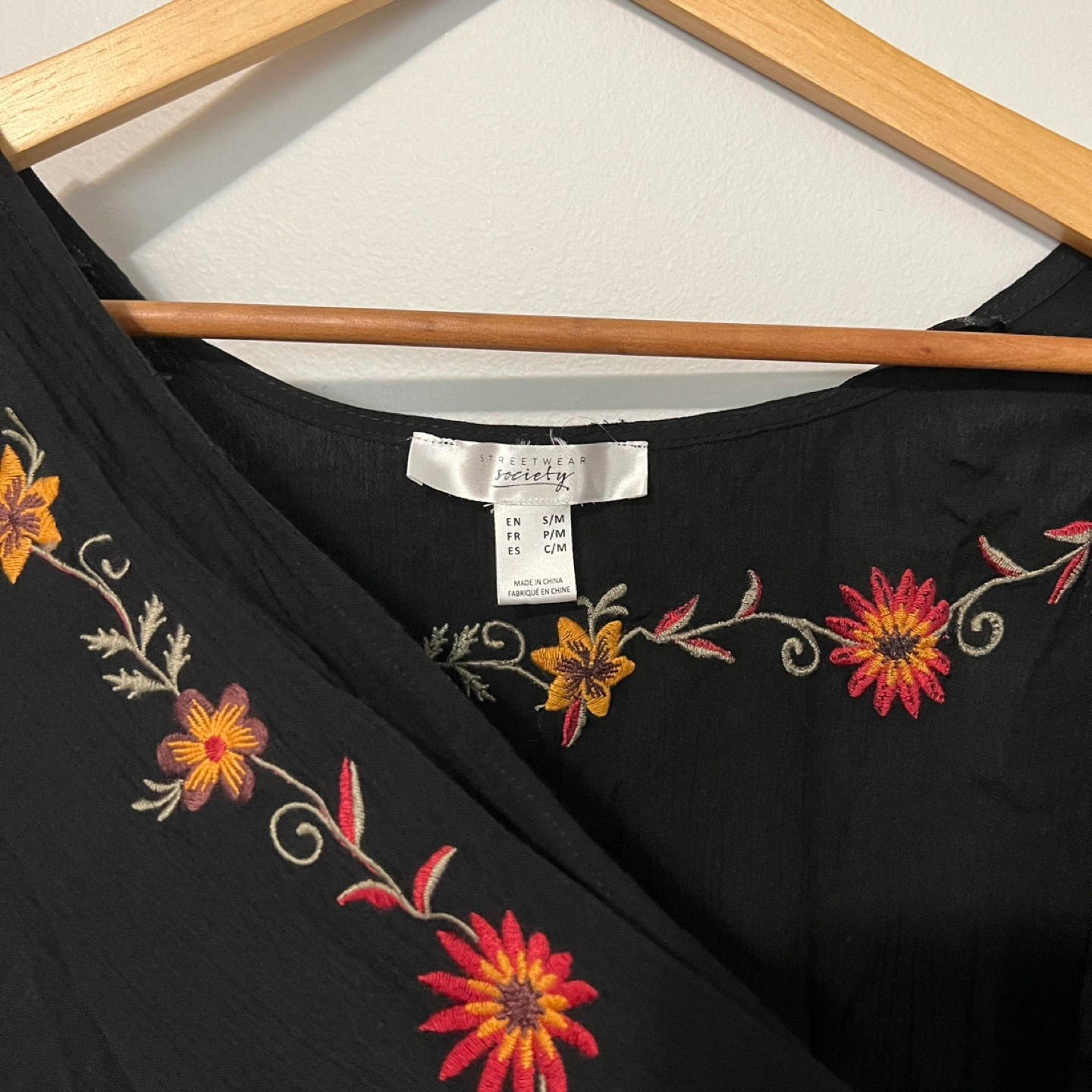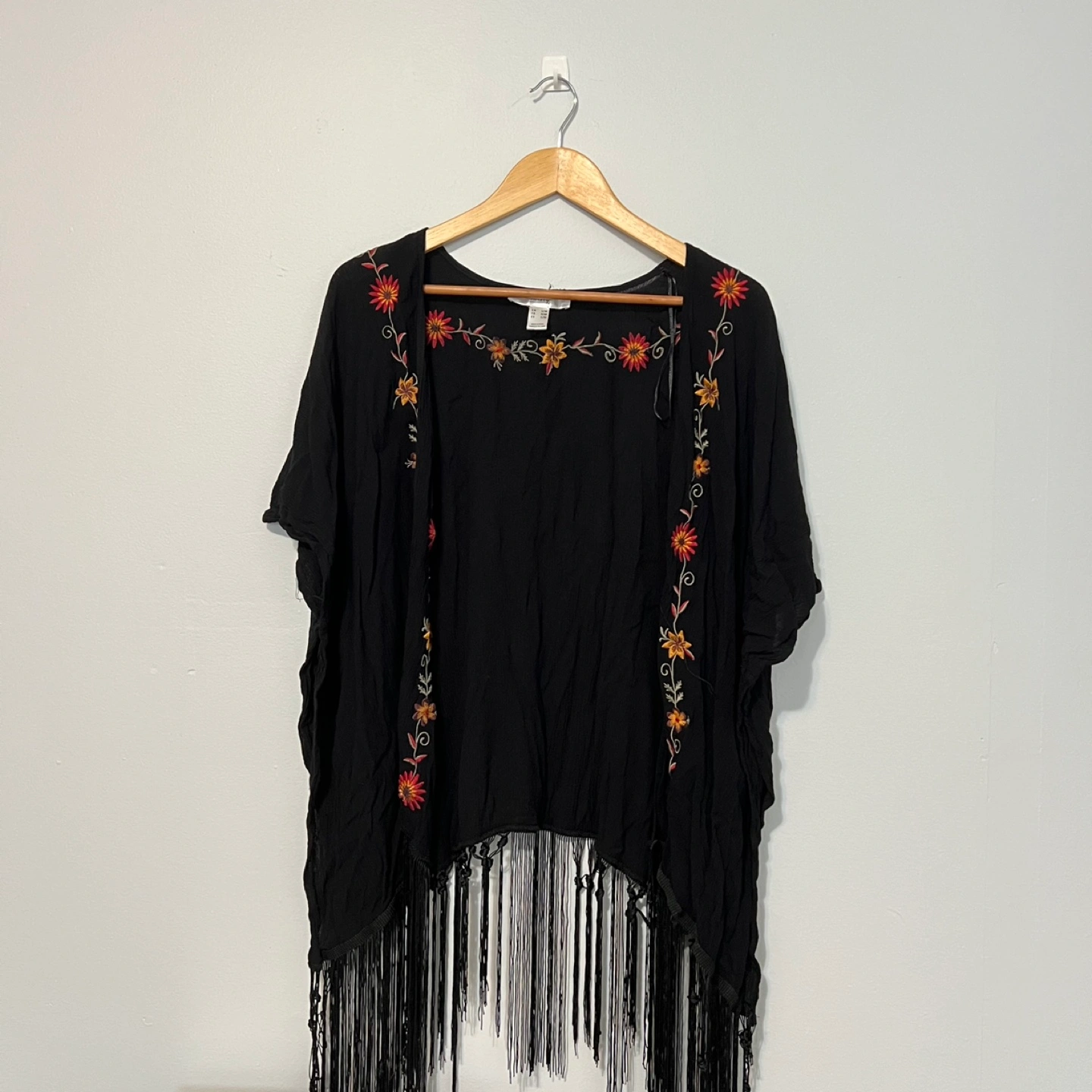 Black Floral Embroidered Short Sleeves Tassel Cover Up Cardigan