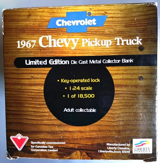 Liberty Classics 1967 Chevy Pickup Truck Canadian Tire Limited Edition die cast metal collector bank. New in box, never opened, but box has some minor damage from storage (see photo). This is a 1:24 scale model. It's #3 in a series of 4, with a production run of 18,500 pieces. Happy to meet up in downtown Kitchener