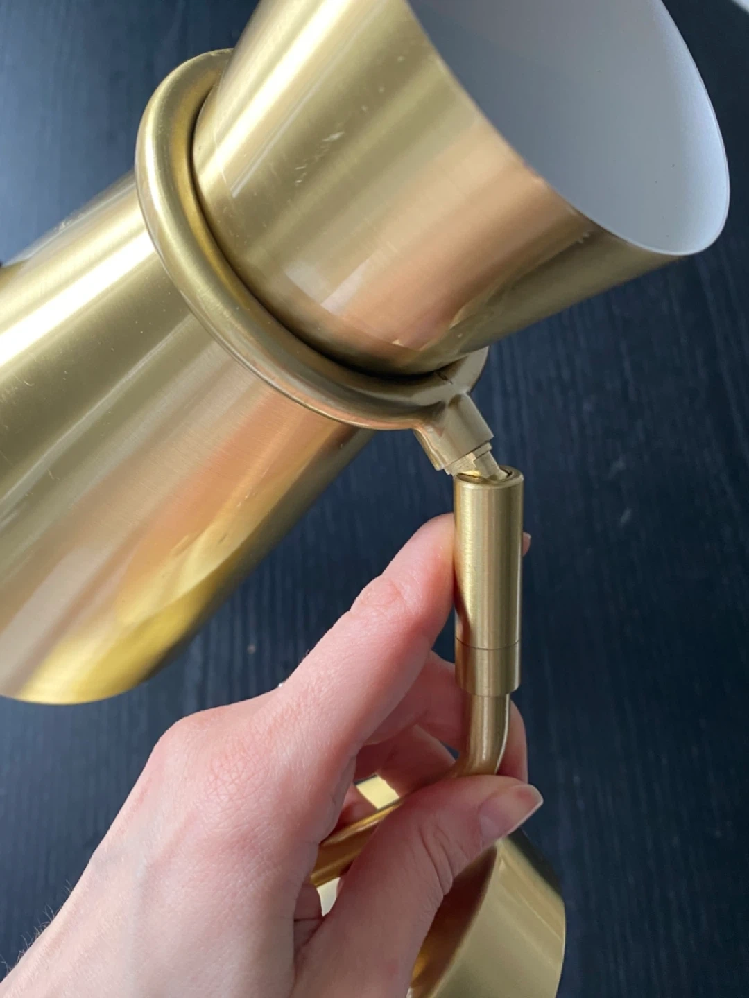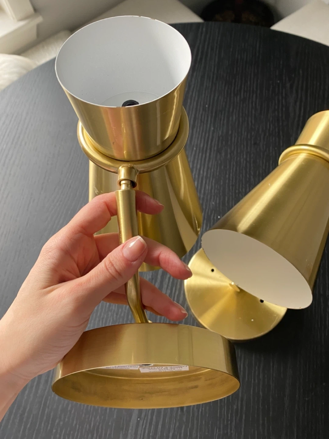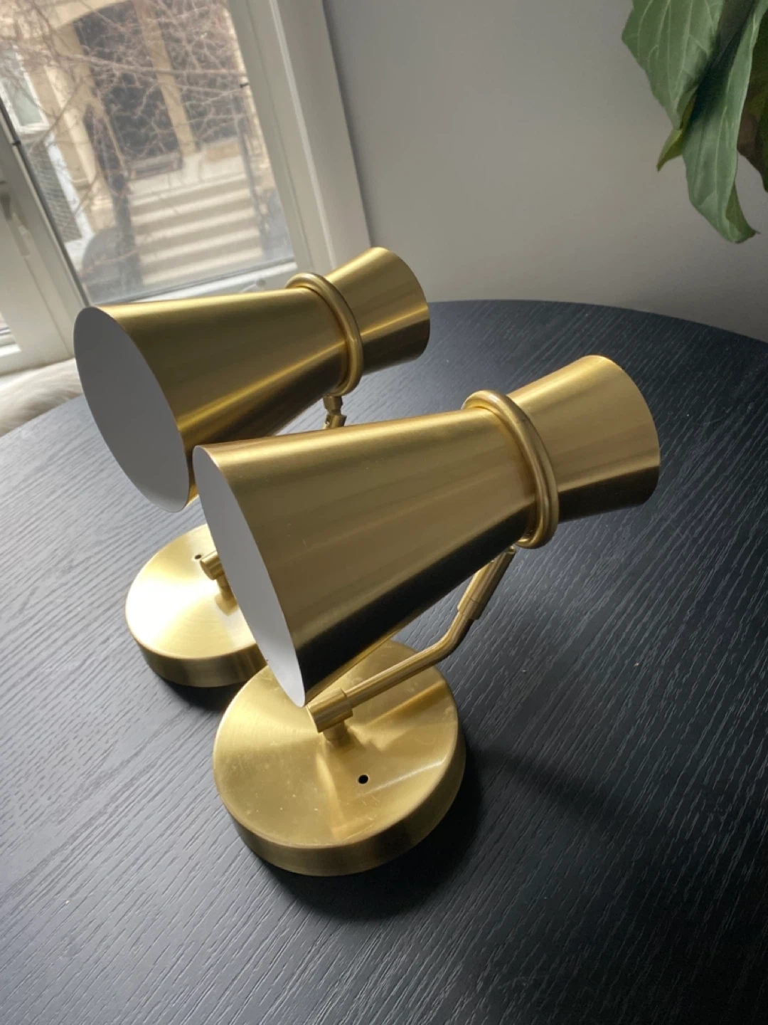 Each sconce has a cone-shaped shade with adjustable head to angle up or down.