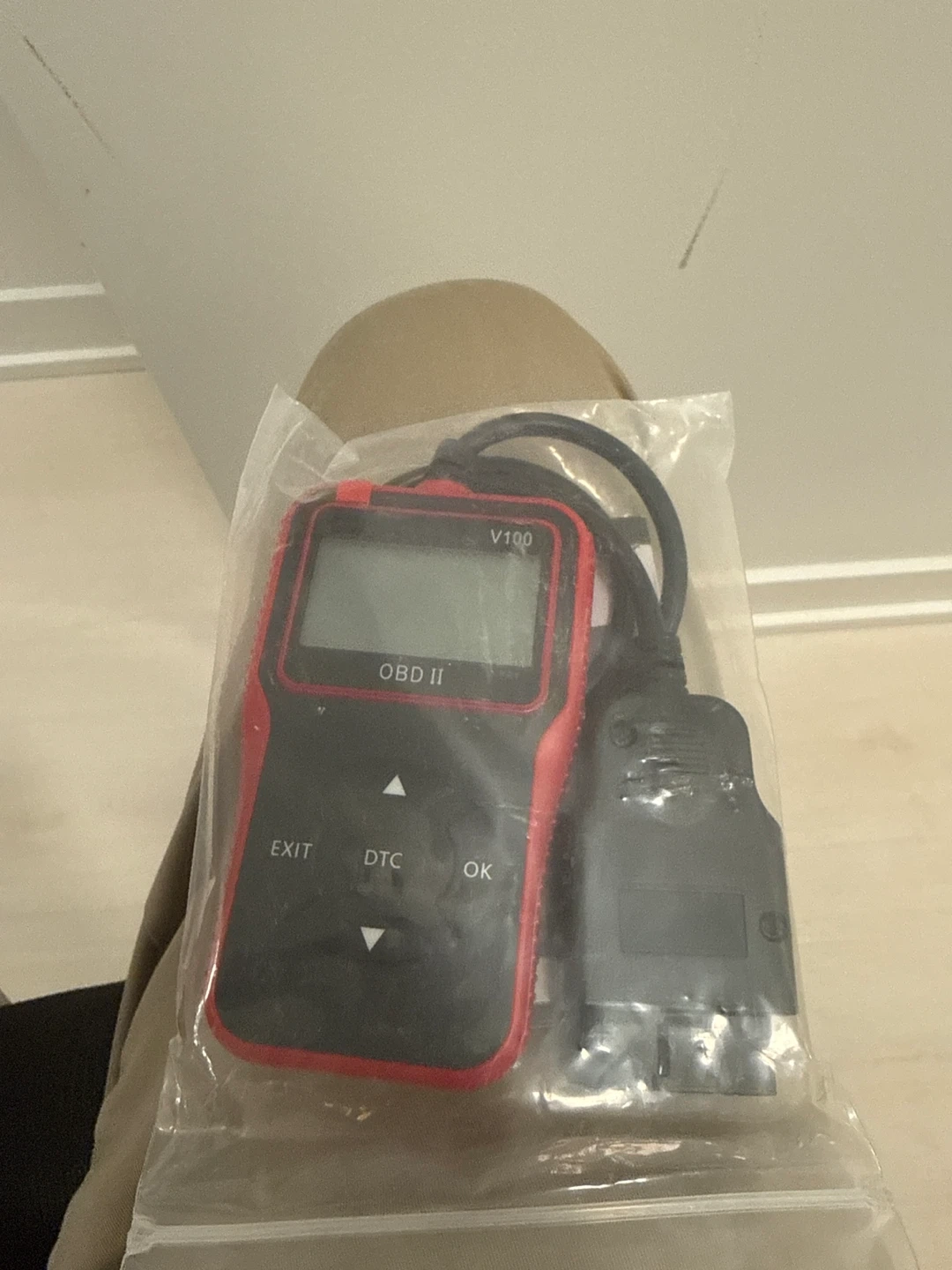 This is a V100 OBD II code reader and diagnostic tool. It's in good condition and comes with its cable. It's a handy tool for checking your vehicle's engine codes.