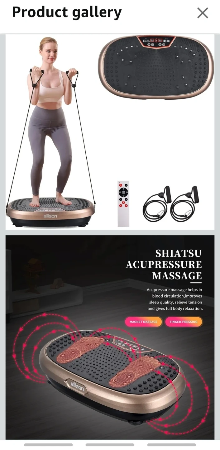 This Ellson whole-body workout vibration platform offers shiatsu acupressure massage for improved circulation and relaxation. It has 5 programs, 99 speed levels, and a 15-minute working cycle. It supports up to 350 lbs max weight and includes resistance bands and a remote. This machine is useful for promoting wellness and recovery.