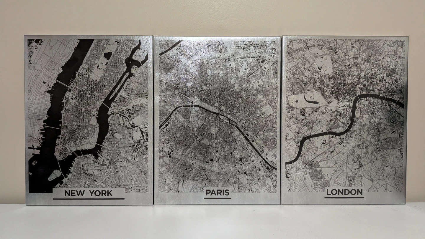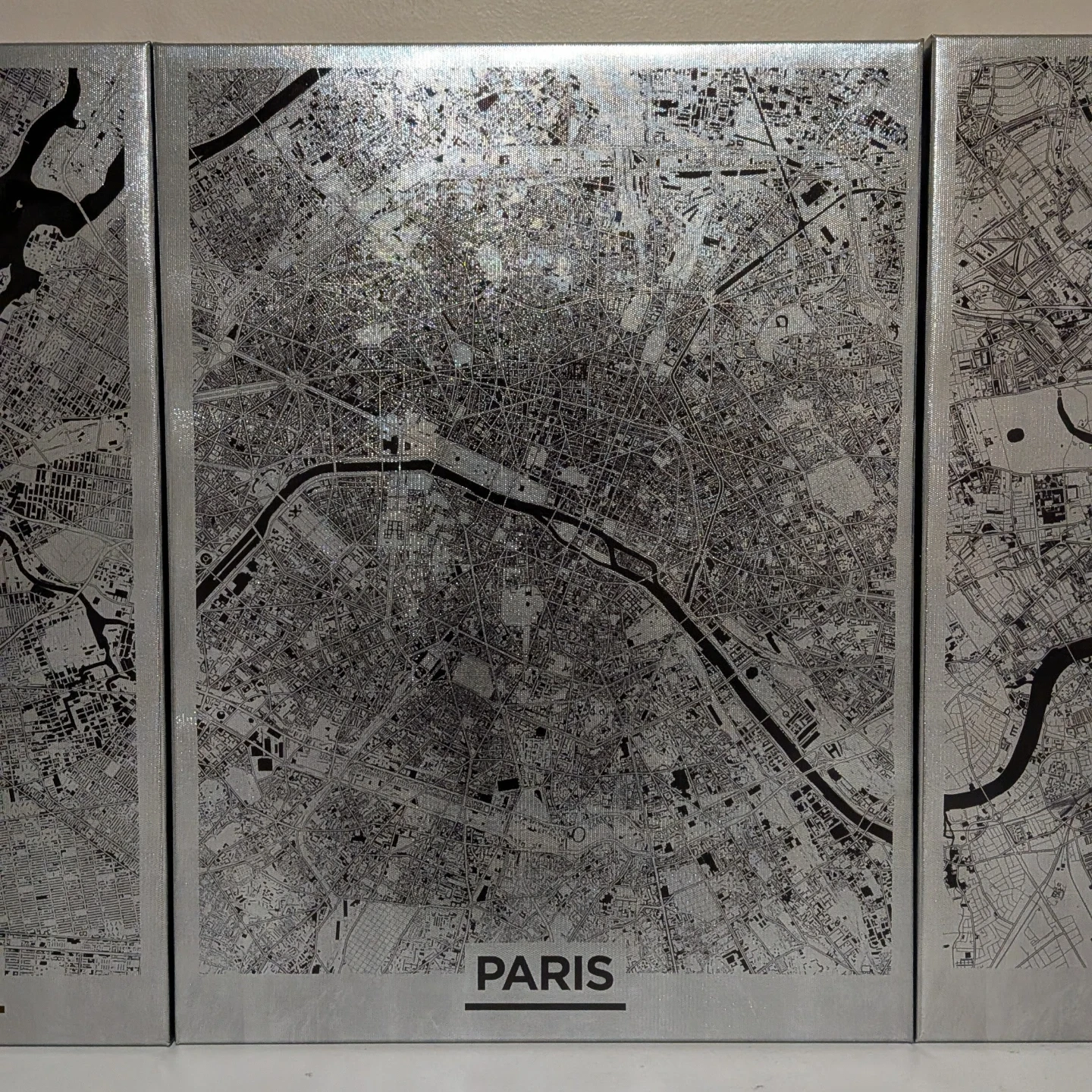 Three piece set of modern city wall art. Features New York City, Paris and London. The rivers between the posters loosely connect together making for a nice design.