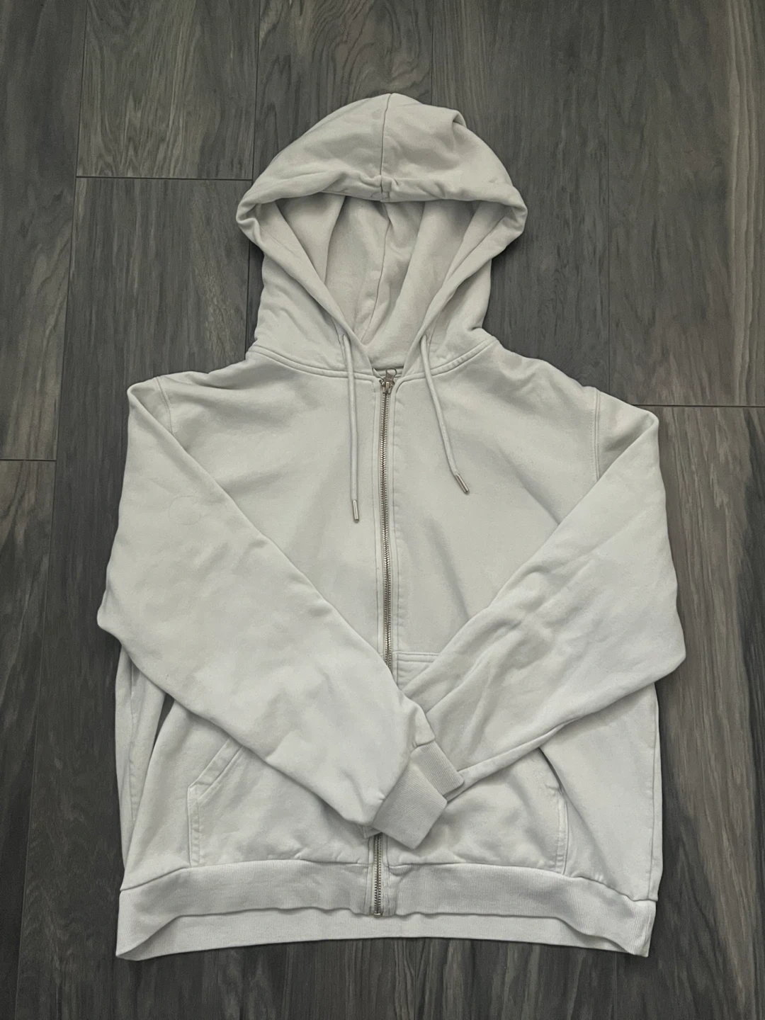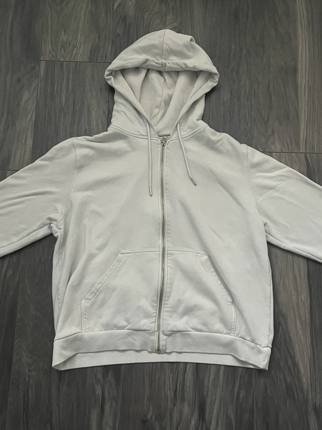 White zip-up hoodie. Good basic staple piece. Cotton blend material. Soft and comfortable. Can be worn oversized.