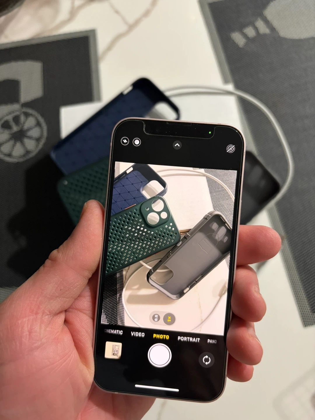 Has screen protector on, comes with 3 cases and a charger.