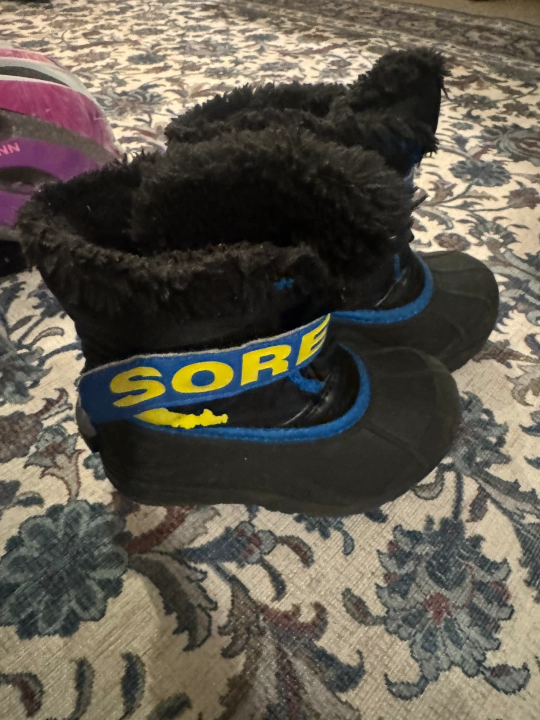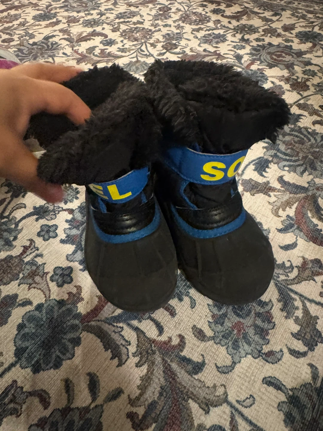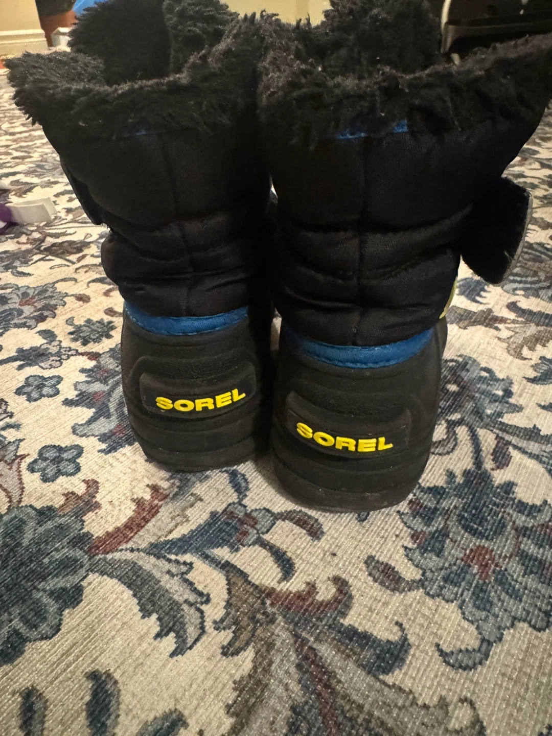 Warm Sorel winter boots with a black exterior and blue accents. They're lined with faux fur for extra coziness. Perfect for keeping little feet toasty on cold days!