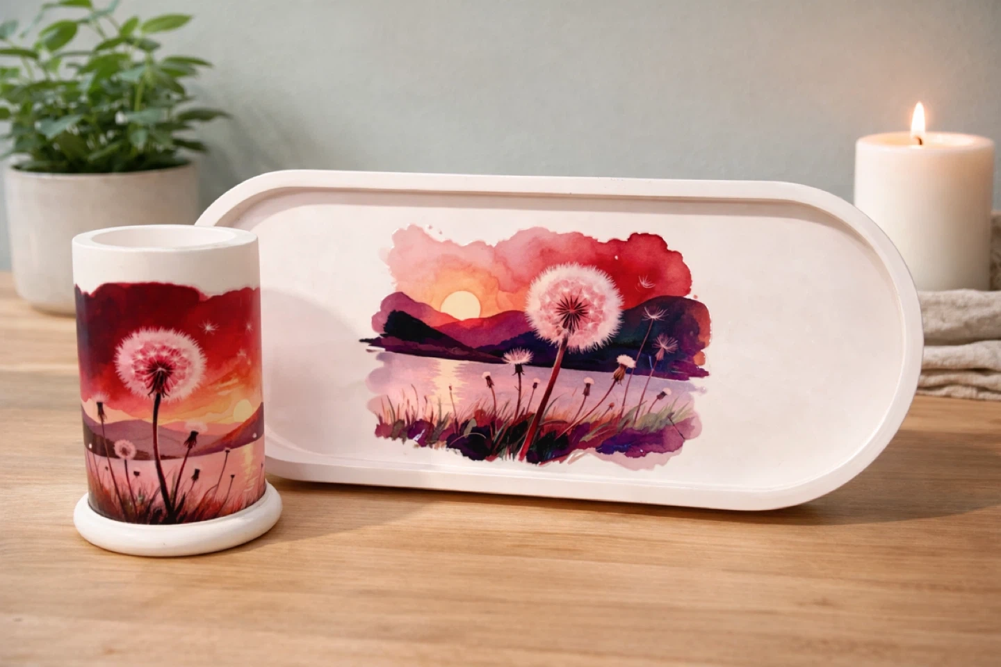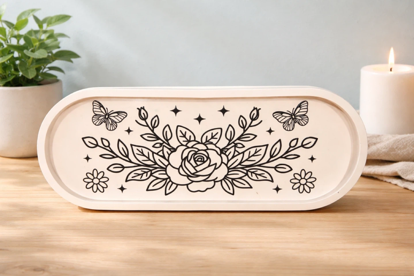 This oval tray and bowl is made of a durable eco resin material. It's perfect for holding small trinkets, keys, or jewelry. Several designs are available, including floral patterns and whimsical trees. $15 with matching pen/makeup brush cup