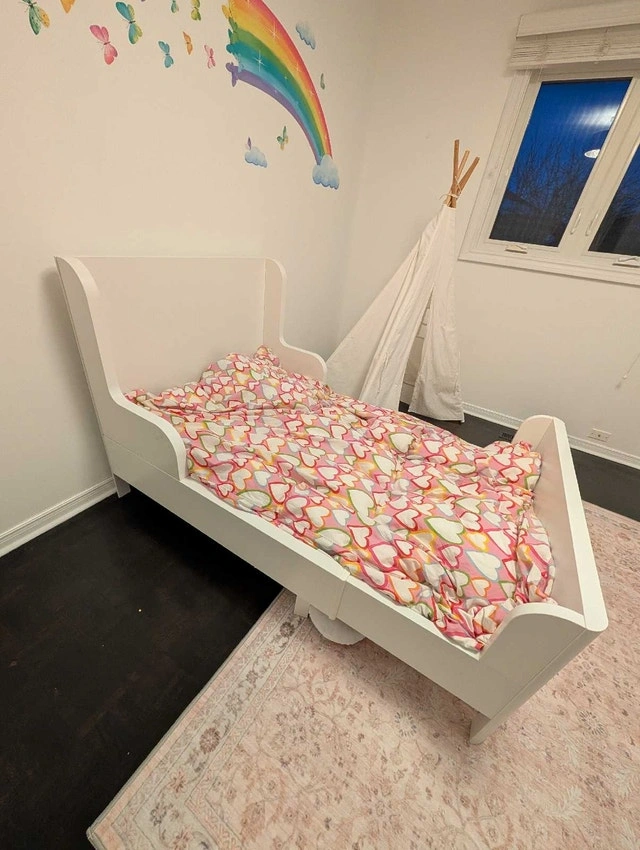 This toddler bed from Ikea is perfect for transitioning your little one from a crib! The bed is also adjustable. It's in good condition, ready to bring sweet dreams to its next owner. I've loved this bed, and I'm sure your child will too! I actually have 2 identical beds available. Let's make bedtime a bit more magical, shall we?