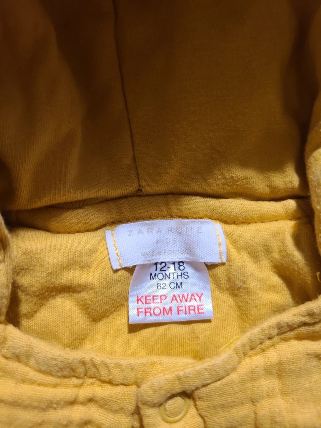 A cute yellow hooded onesie from Zara Home Kids. It's designed for babies aged 12-18 months, fitting up to 82 cm. The textured fabric is lightweight and breathable.