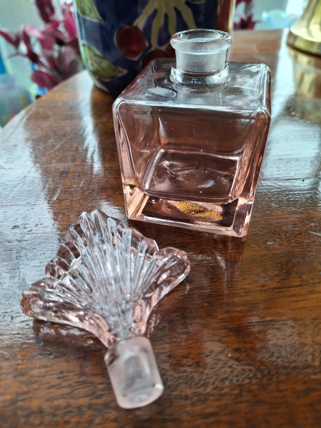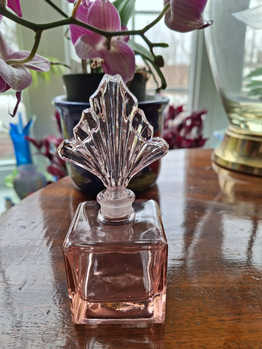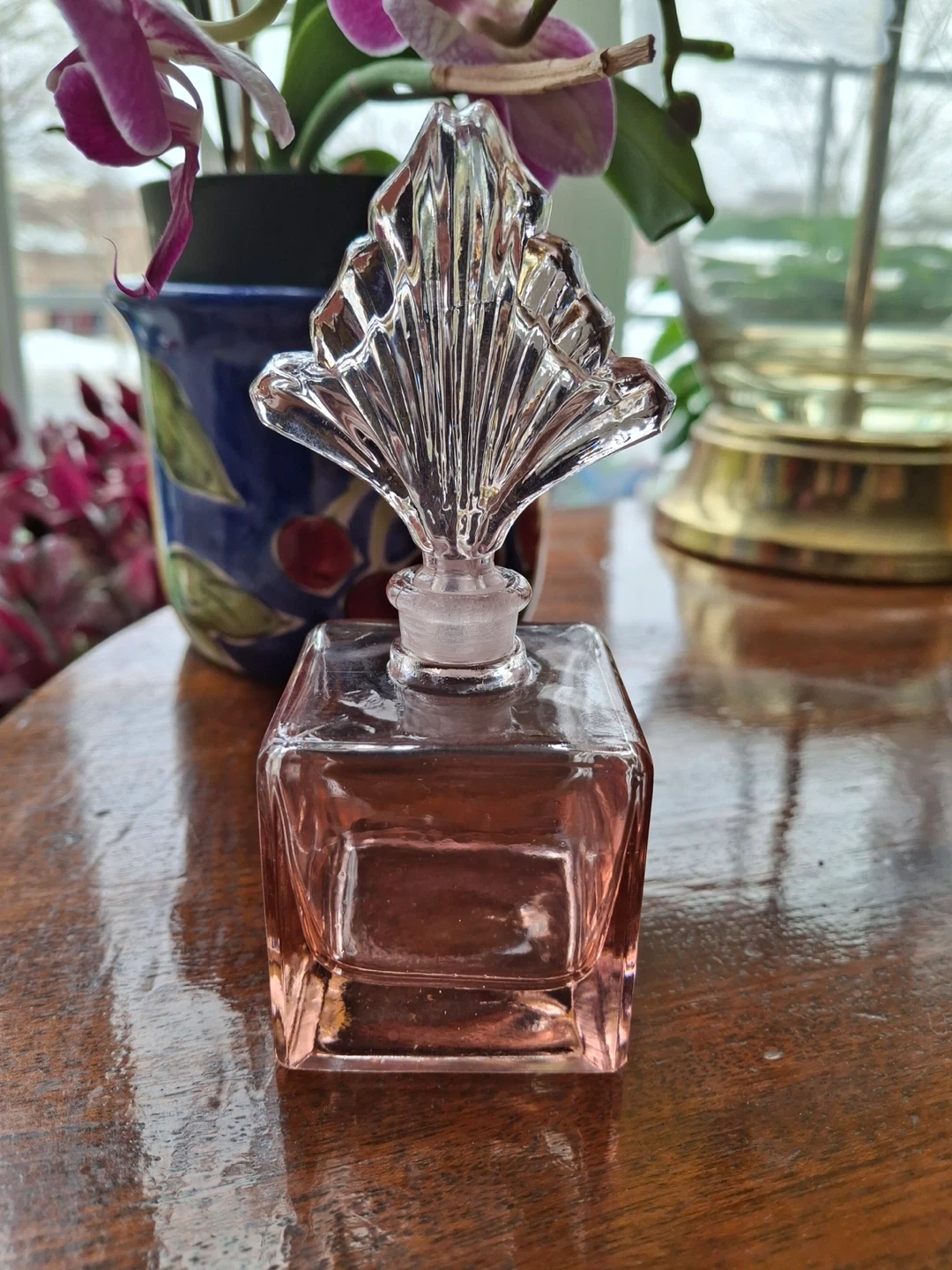 Pink glass perfume bottle with square bottom and pretty fan-like stopper. 5” high and 2” across. Excellent condition.
