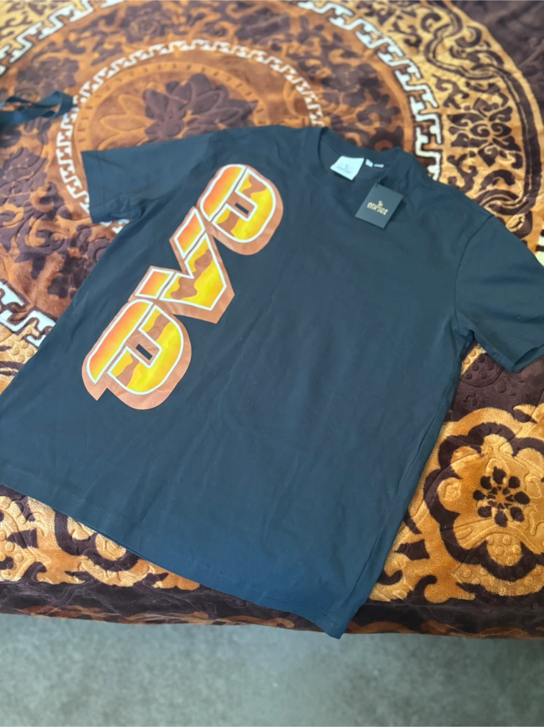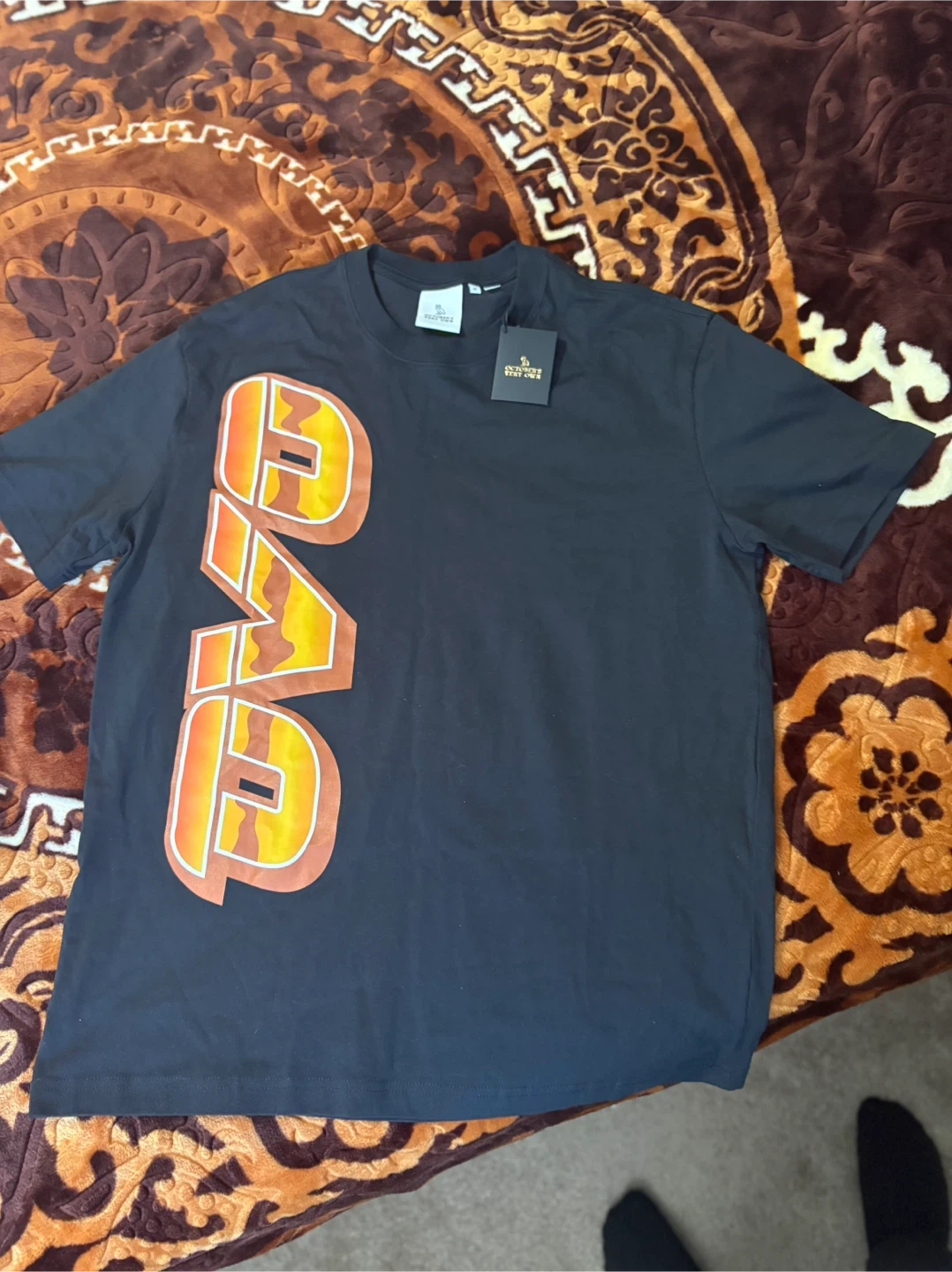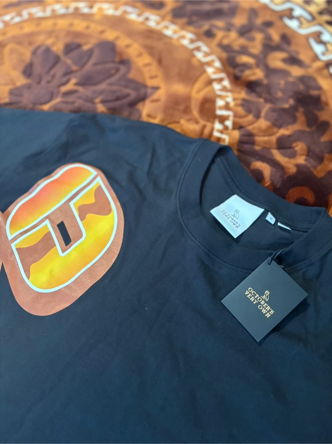 Black OVO t-shirt with a large "OVO" graphic on the front. It features the October's Very Own owl logo on the back. Size medium. It is a limited edition T-shirt. If you’re interested let me know. I can mail it to you as well as long as we agree on the payment and everything.