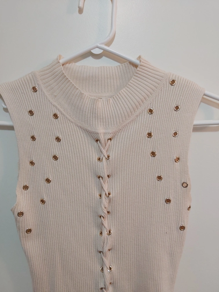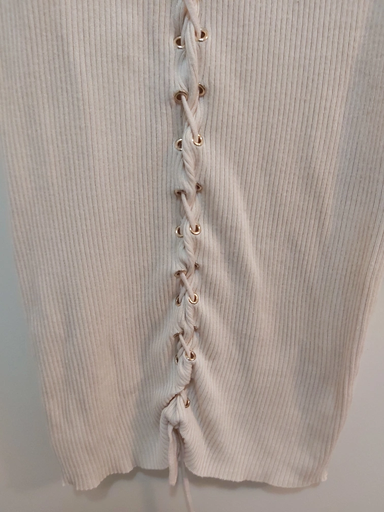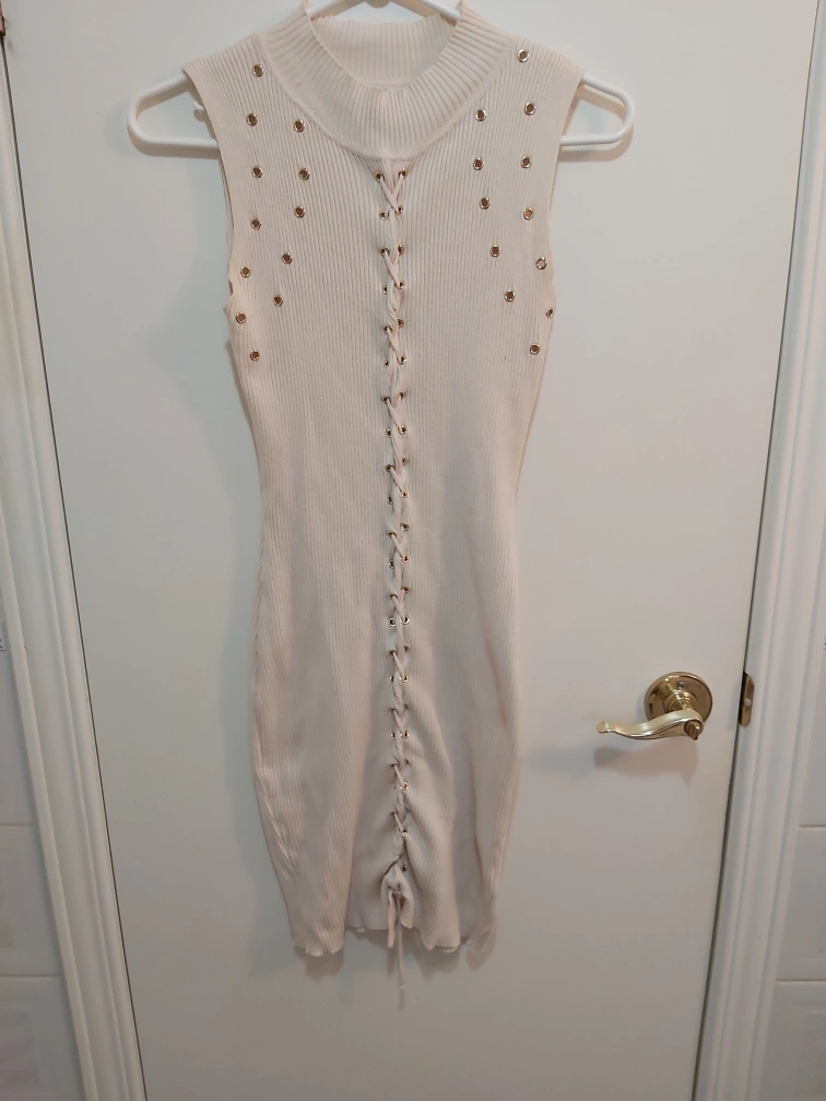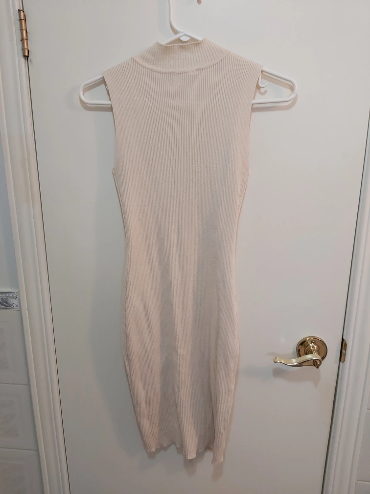 Type: Ribbed bodycon sleeveless dress; little cut outs/ "holes"; scrunches all along the middle and bottom