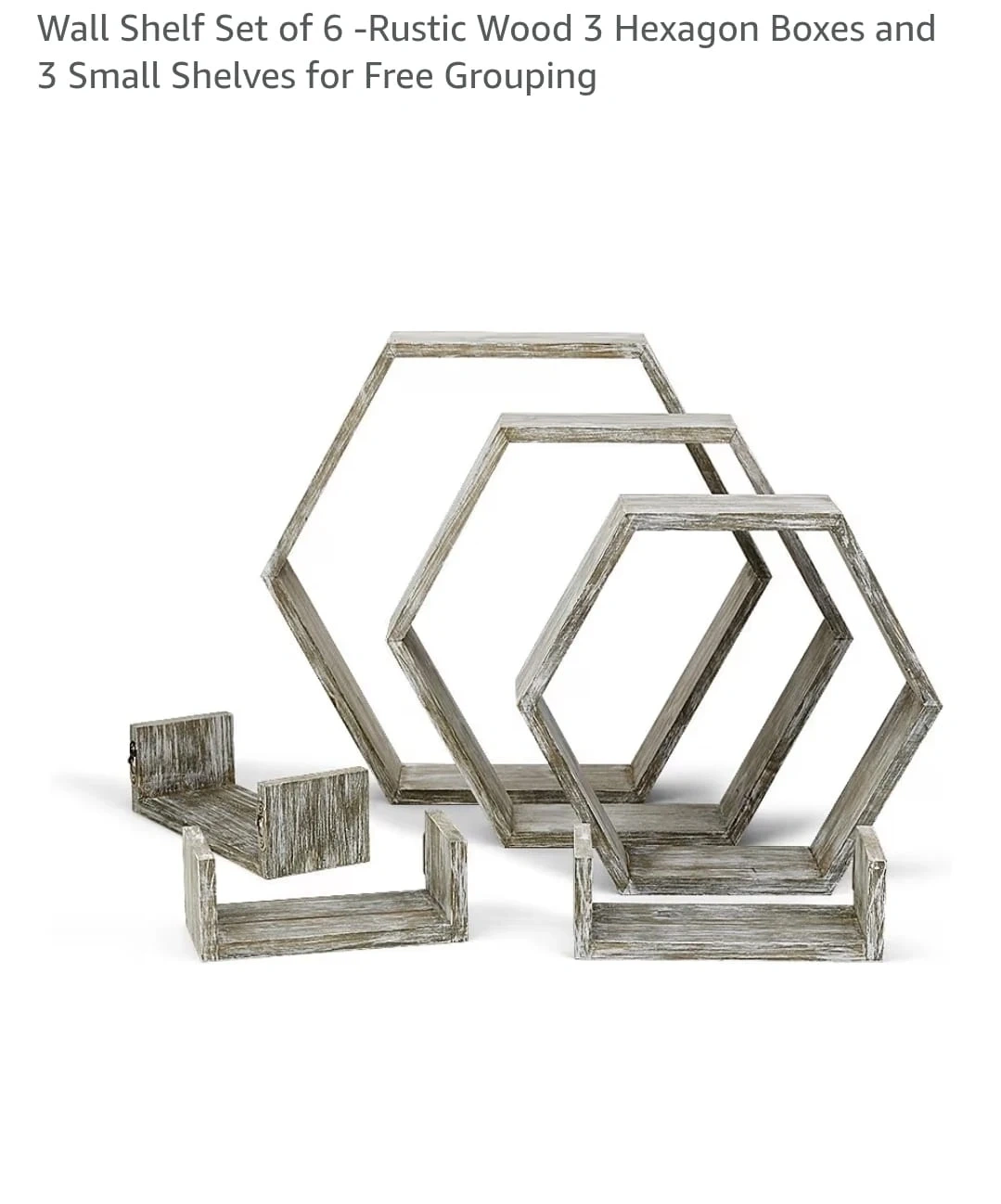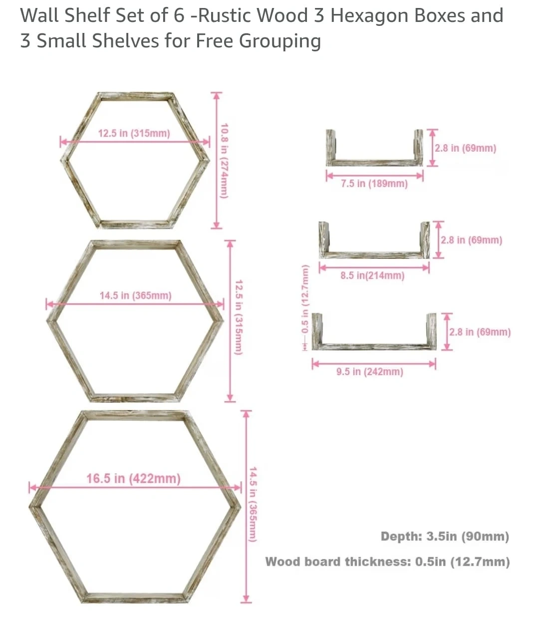 Set includes 3 hexagon boxes and 3 small shelves. Made from rustic wood with a grey wash finish. Hexagon dimensions vary from 12.5 to 16.5 inches. Small shelf dimensions are 7.5 to 9.5 inches long.