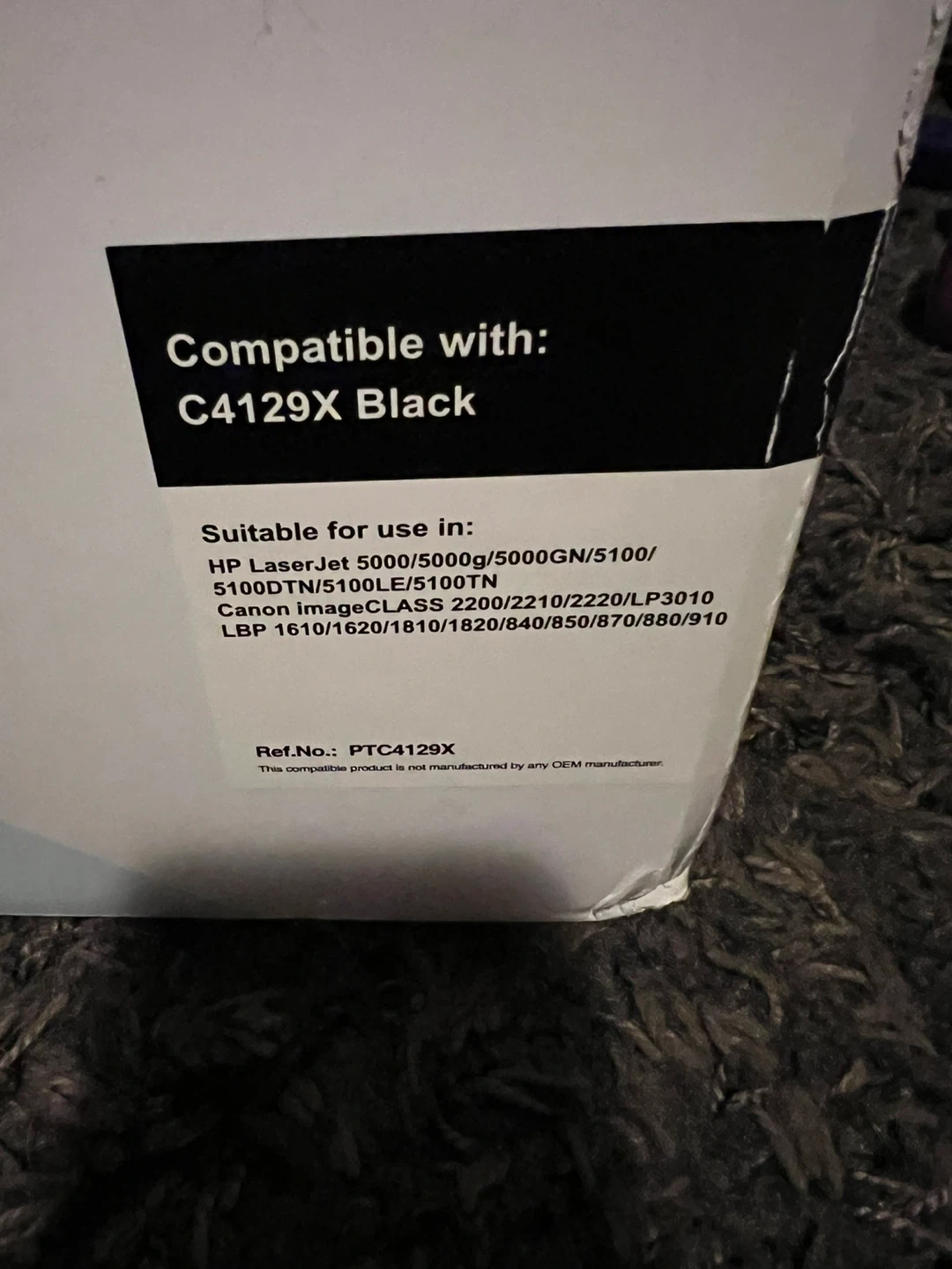 This is a premium compatible laser toner cartridge. It's suitable for use in HP LaserJet 5000/5000g/5000GN/5100/5100DTN/5100LE/5100TN and Canon ImageCLASS 2200/2210/2220/LP3010 and LBP 1610/1620/1810/1820/840/850/870/880/910 printers. Designed to print crisp graphics and text.