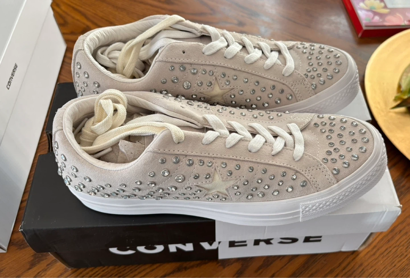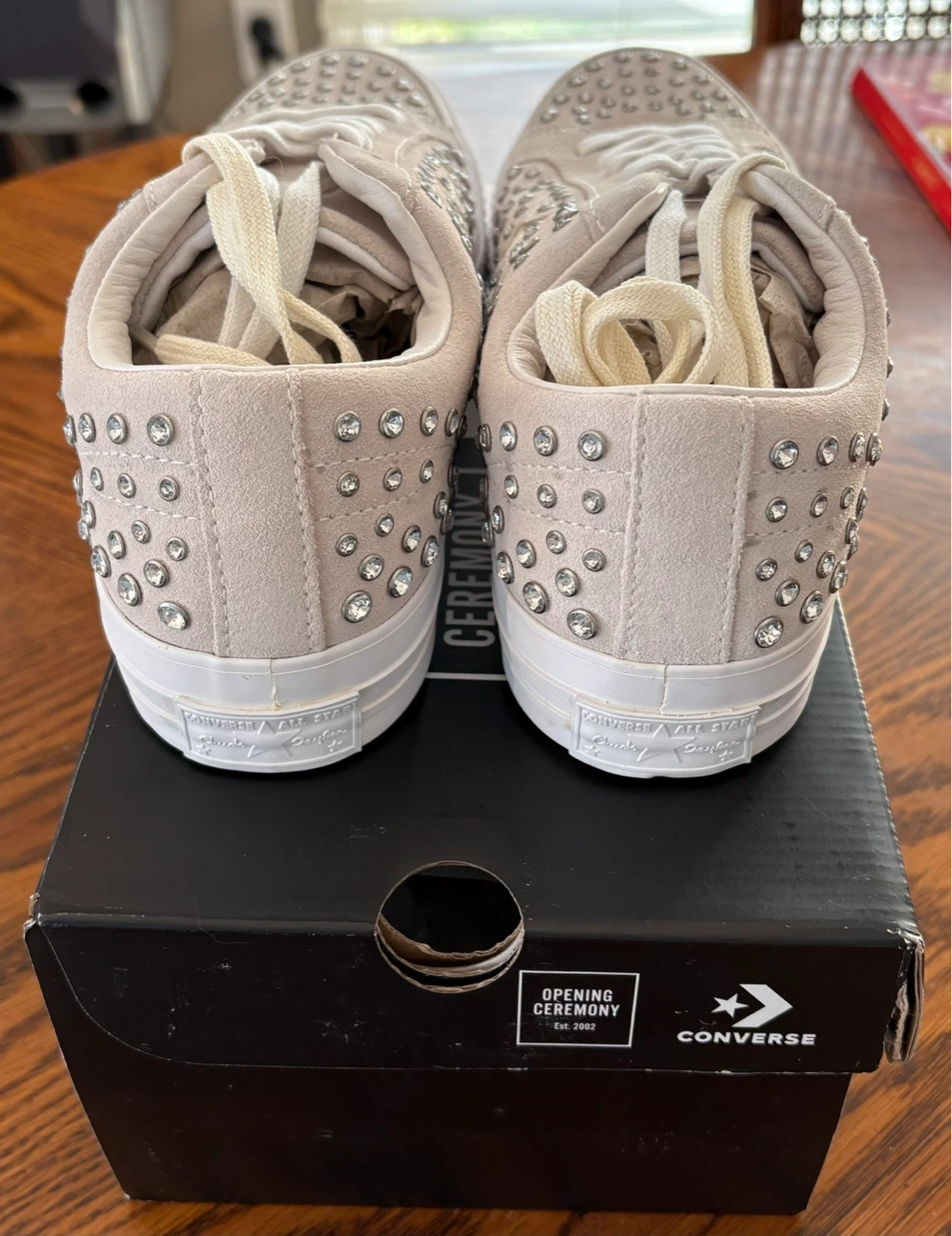 These Converse One Star sneakers are a collaboration with Opening Ceremony. They feature a light tan suede upper with all-over silver-tone stud detailing. Includes original box. These are a stylish statement shoe! Price is firm 😊
