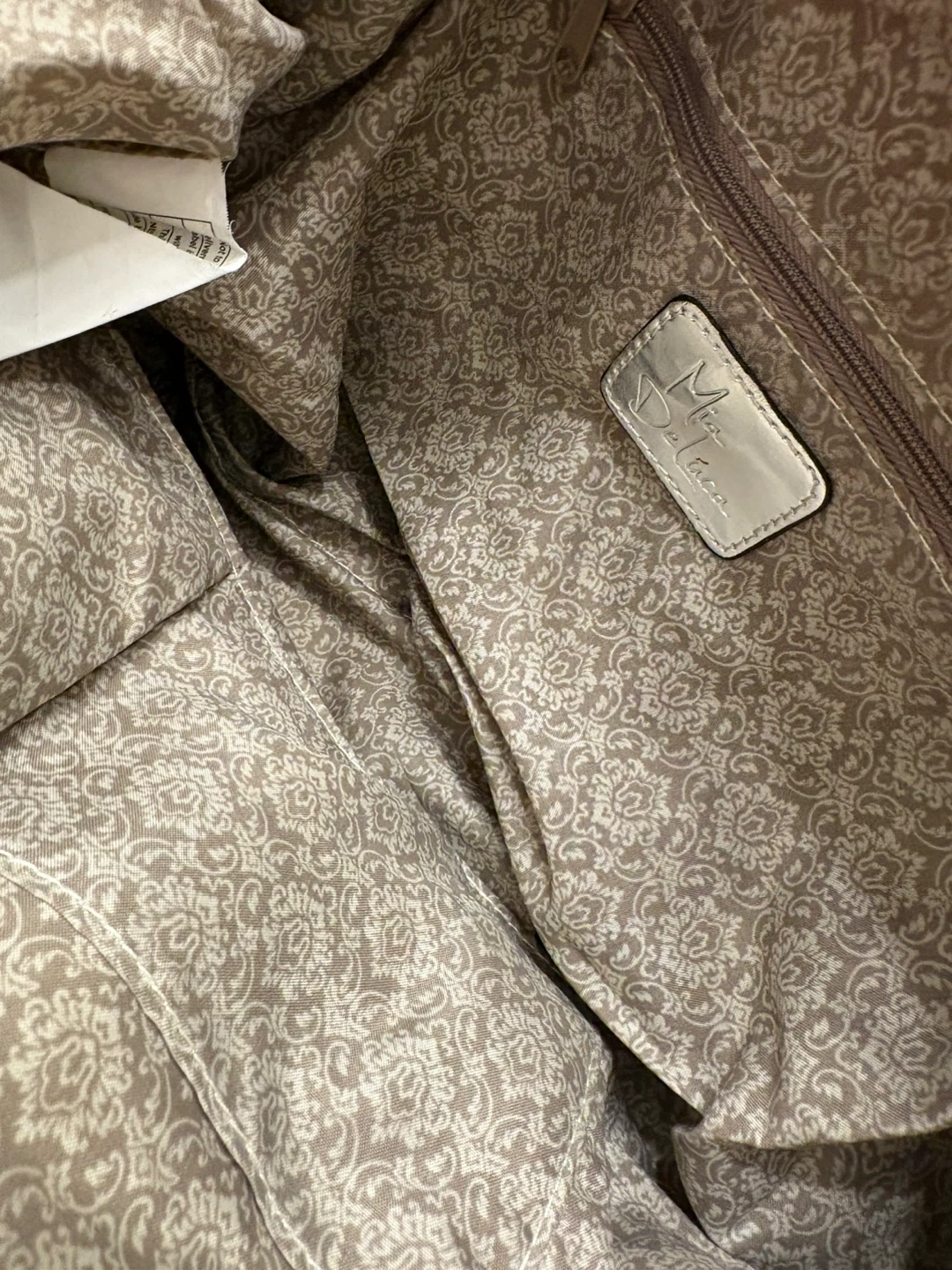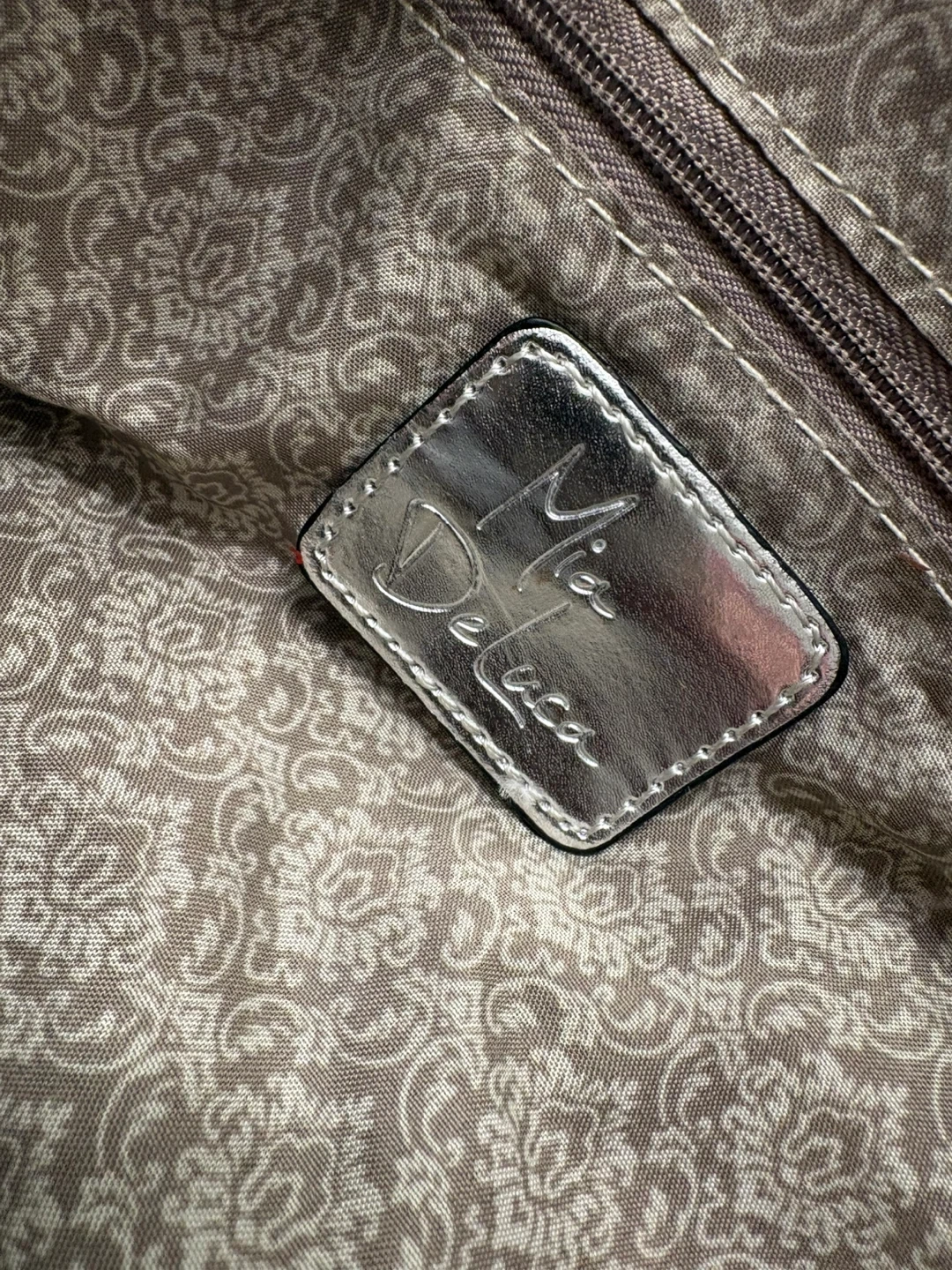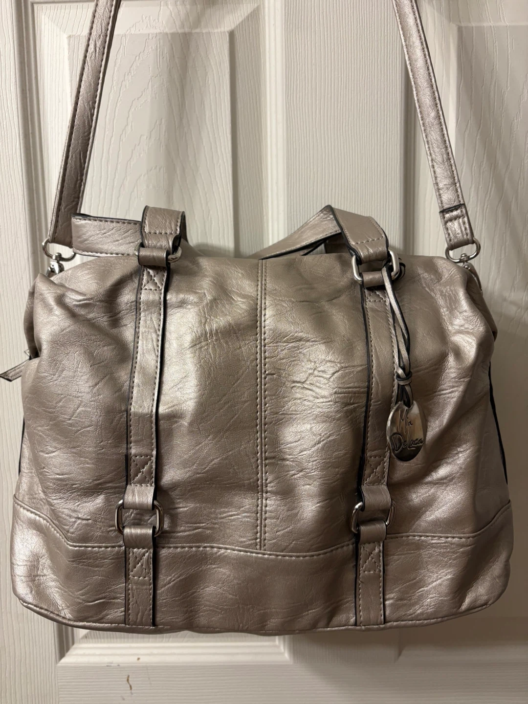 This stylish metallic silver shoulder bag by Mia Deluca is made from a faux leather material. It features both top handles and a detachable shoulder strap for versatile carrying. The bag's metallic finish adds a touch of shine to any outfit. It’s in great condition, just like new! Really spacious handbag! Pick up in Chestermere.