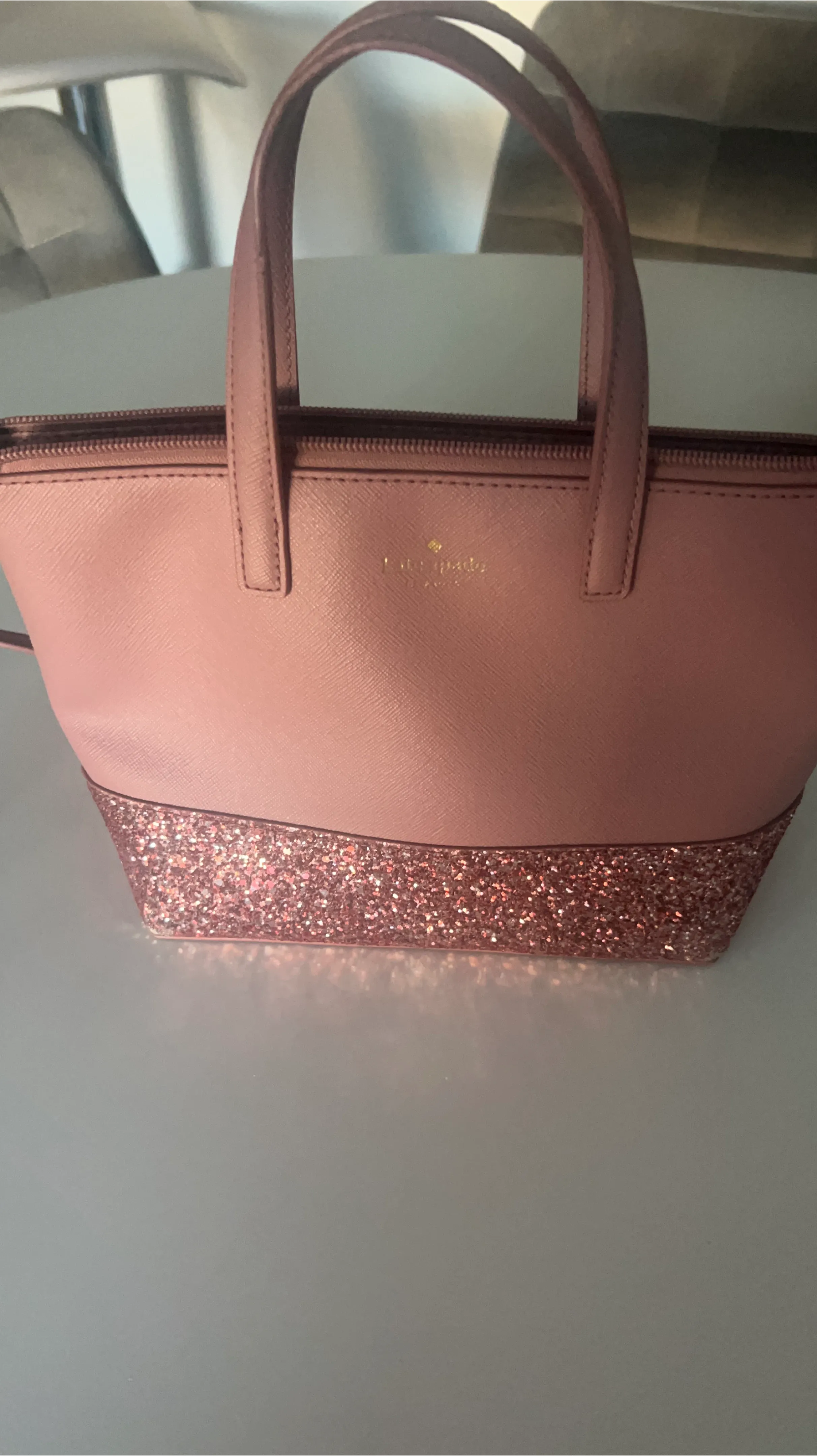 This is a Kate Spade tote bag in a lovely pink colour. It features a glitter trim detail for a touch of sparkle. It's perfect for adding a fun accent to your outfit!