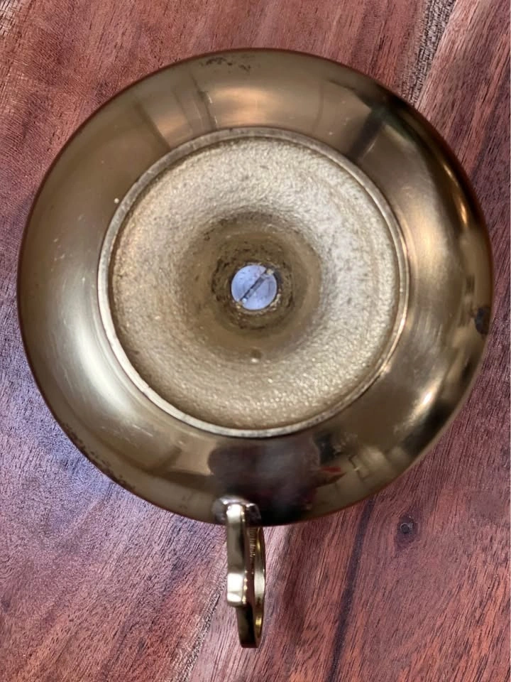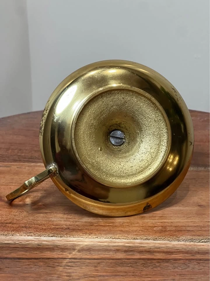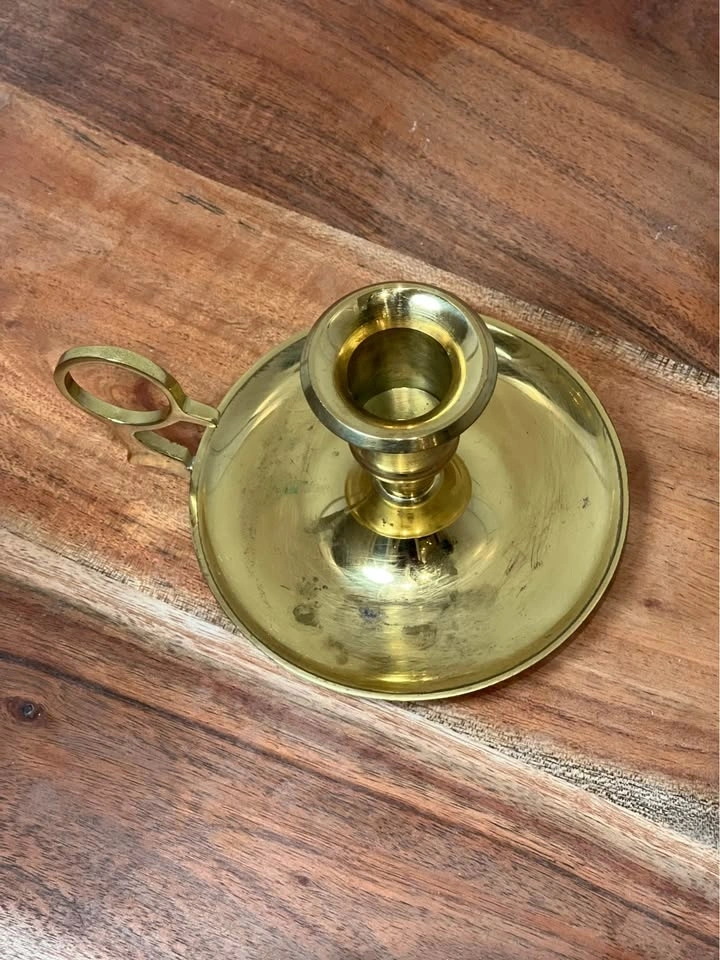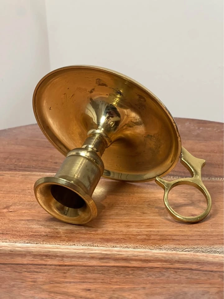 This is a vintage solid brass chamberstick, designed for portability. It features a wide base to catch wax drips and a finger loop for carrying. The screw in the center might indicate a removable candle socket or a gimbal mechanism, common in nautical-style holders. It's great for holding standard taper candles. Preowned. Pickup is 58th and 7th Ave in midtown Manhattan.