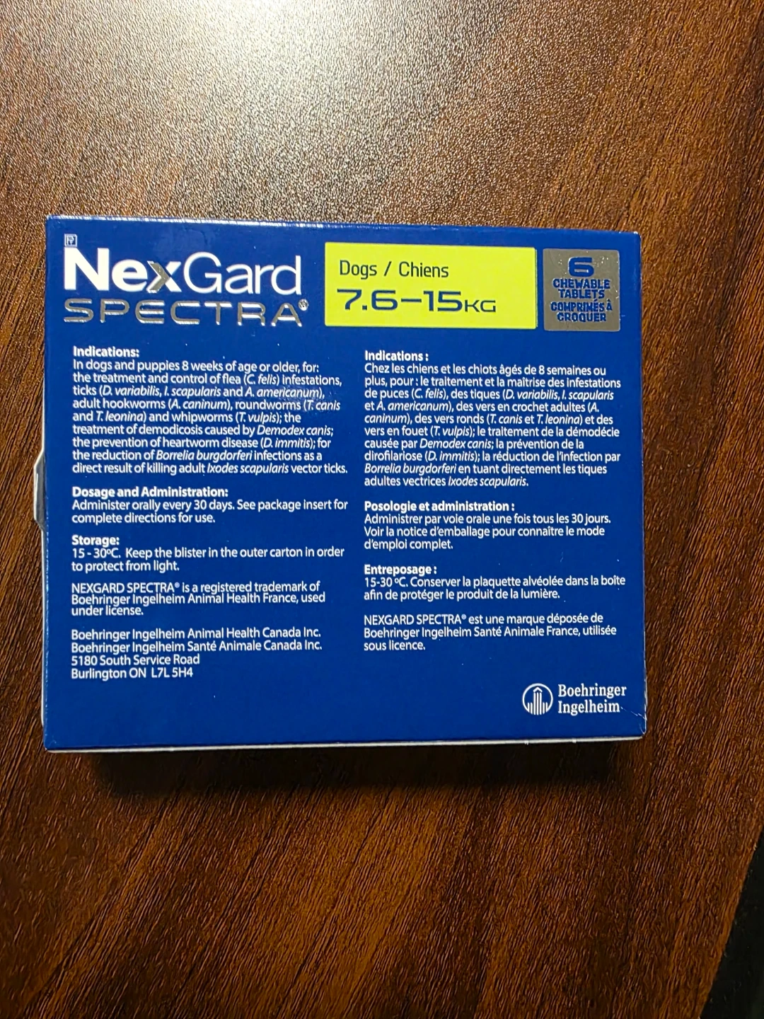 NexGard Spectra chewable tablets for dogs weighing 7.6-15KG. Protects against fleas, ticks, and heartworm. Contains Afoxolaner and Milbemycin Oxime. Expiry date is October 2027.