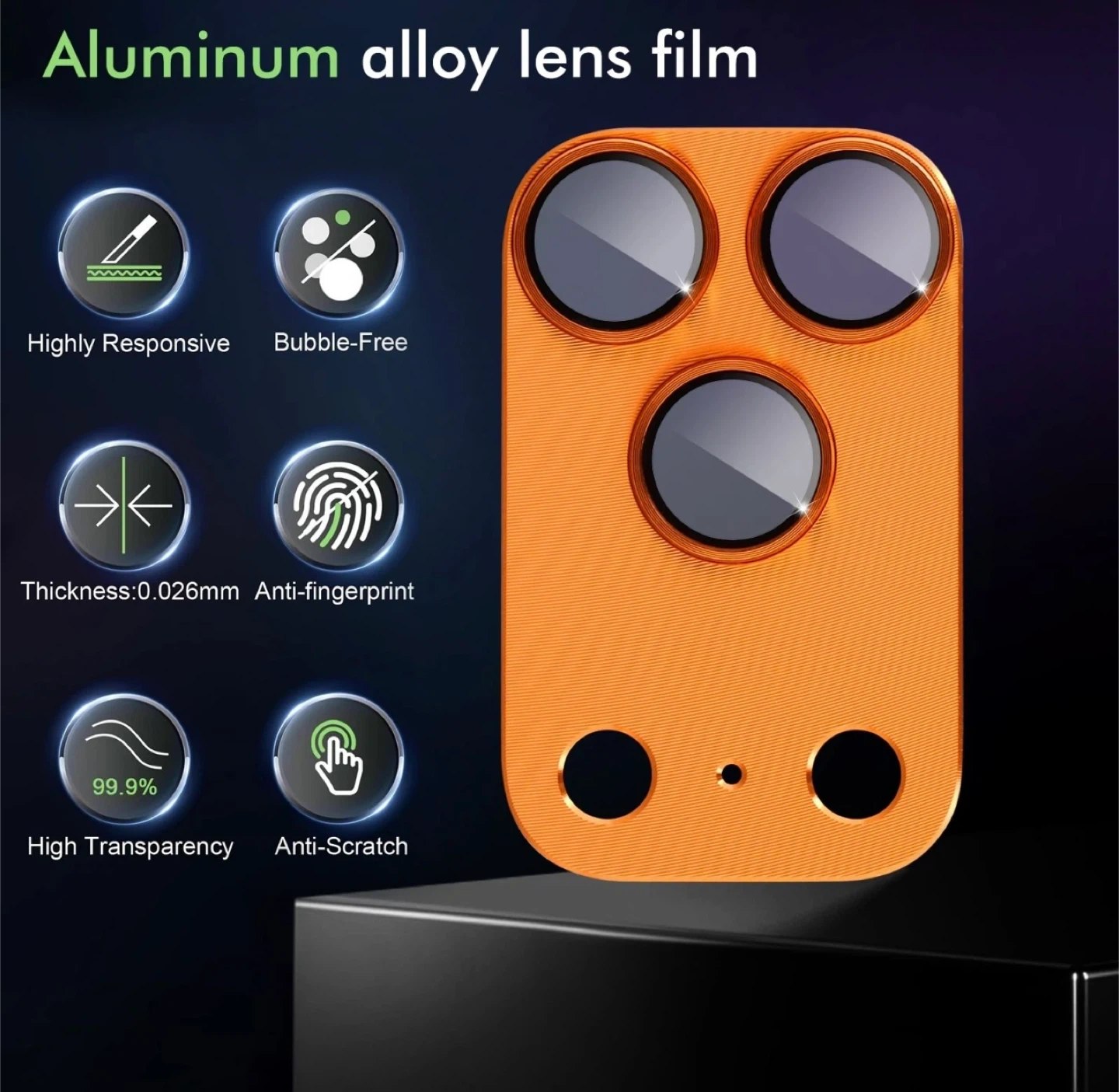 This aluminum alloy lens film offers superior protection and a stylish look. It's highly responsive, bubble-free, anti-fingerprint, anti-scratch, and provides 99.9% high transparency. The thickness is a mere 0.026mm.