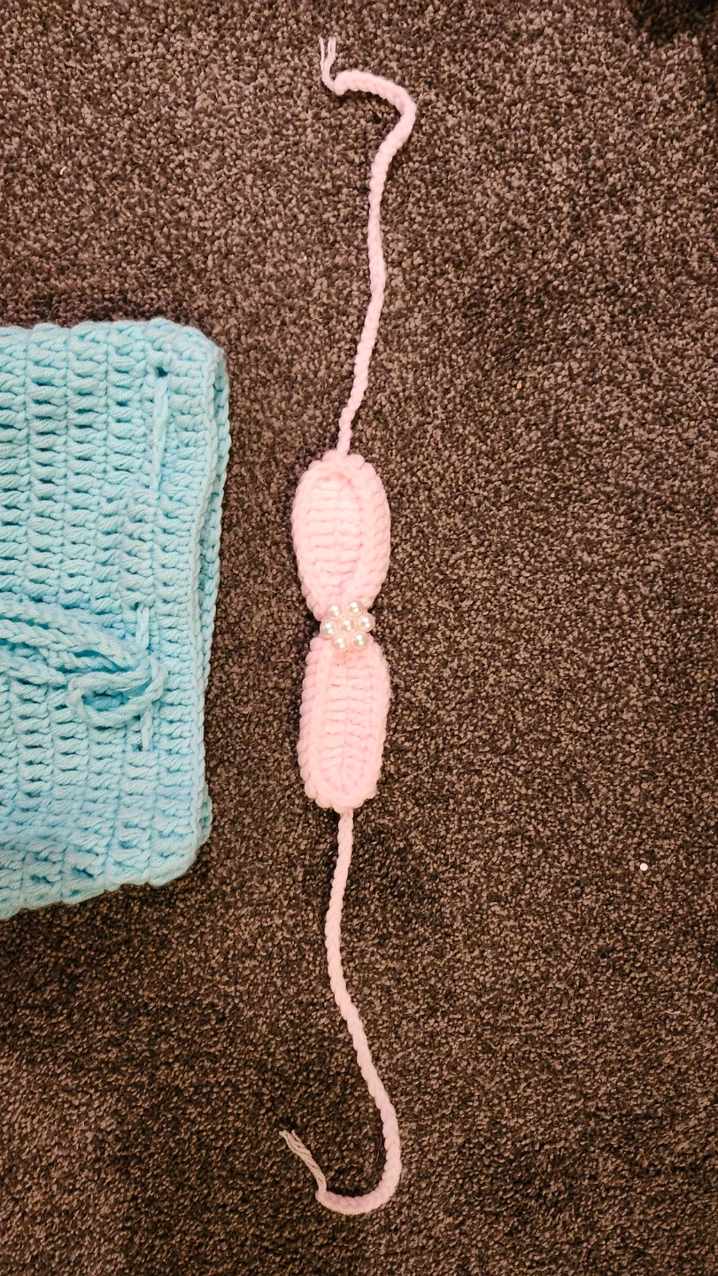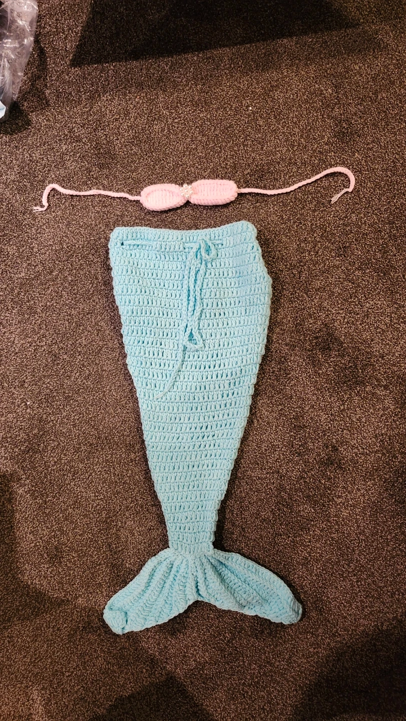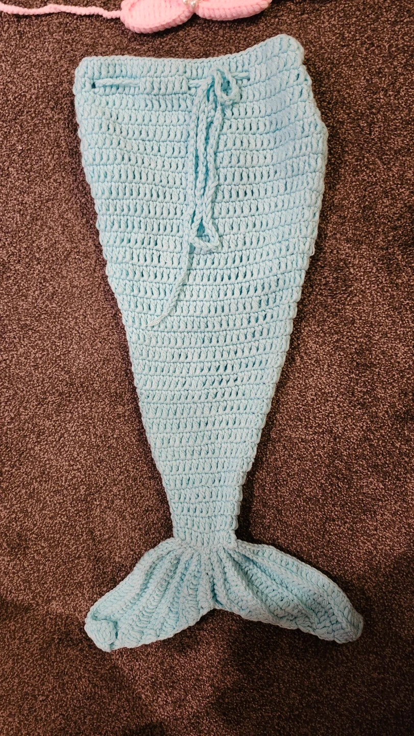 This is a cute crocheted mermaid tail costume in a lovely light blue colour. It comes with a matching pink bikini top adorned with a pearl detail. It's perfect for dress-up or photos! For a newborn
