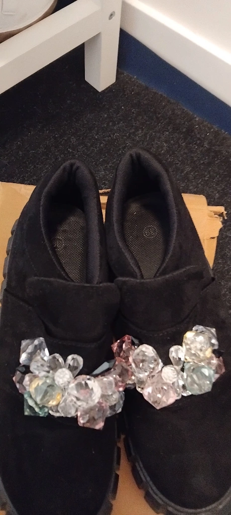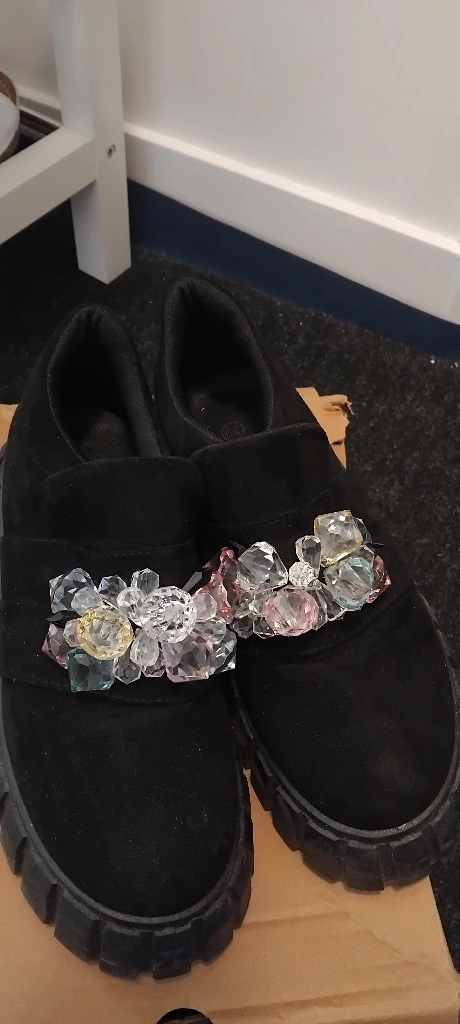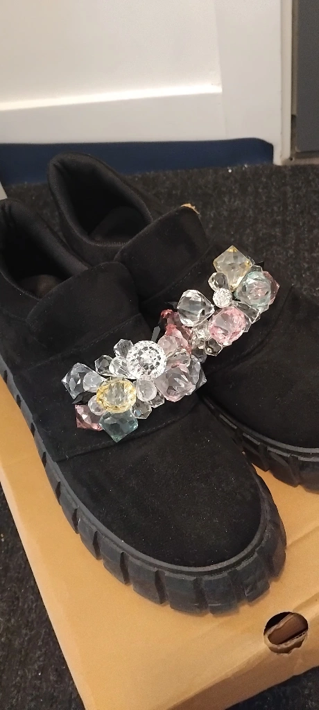 These are a pair of black slip-on shoes with unique crystal embellishments. They're perfect for adding a bit of sparkle to your everyday look!size 39 in canada also considered 9