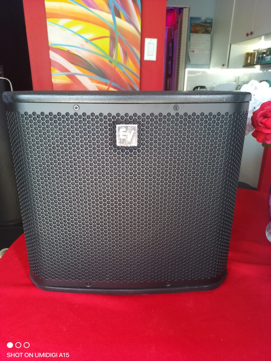 Electro-Voice powered subwoofer. Excellent condition. Includes protective cover. Features level control, low-end boost, and reverse polarity switch. Multiple inputs and outputs. excellent for DJ/ band/ karaoke events
