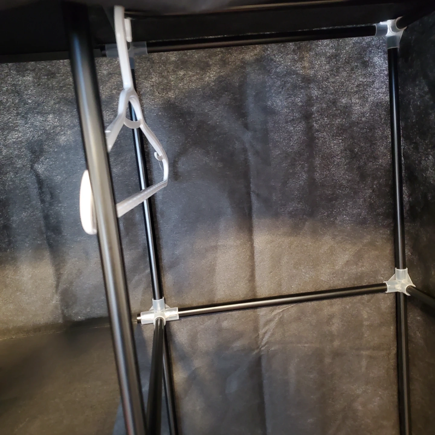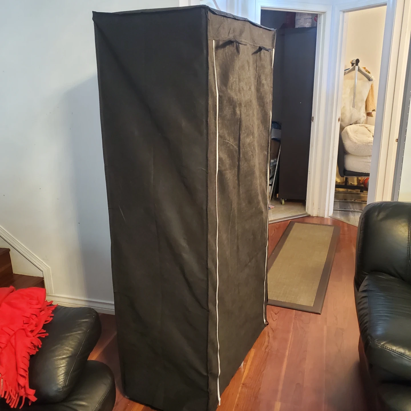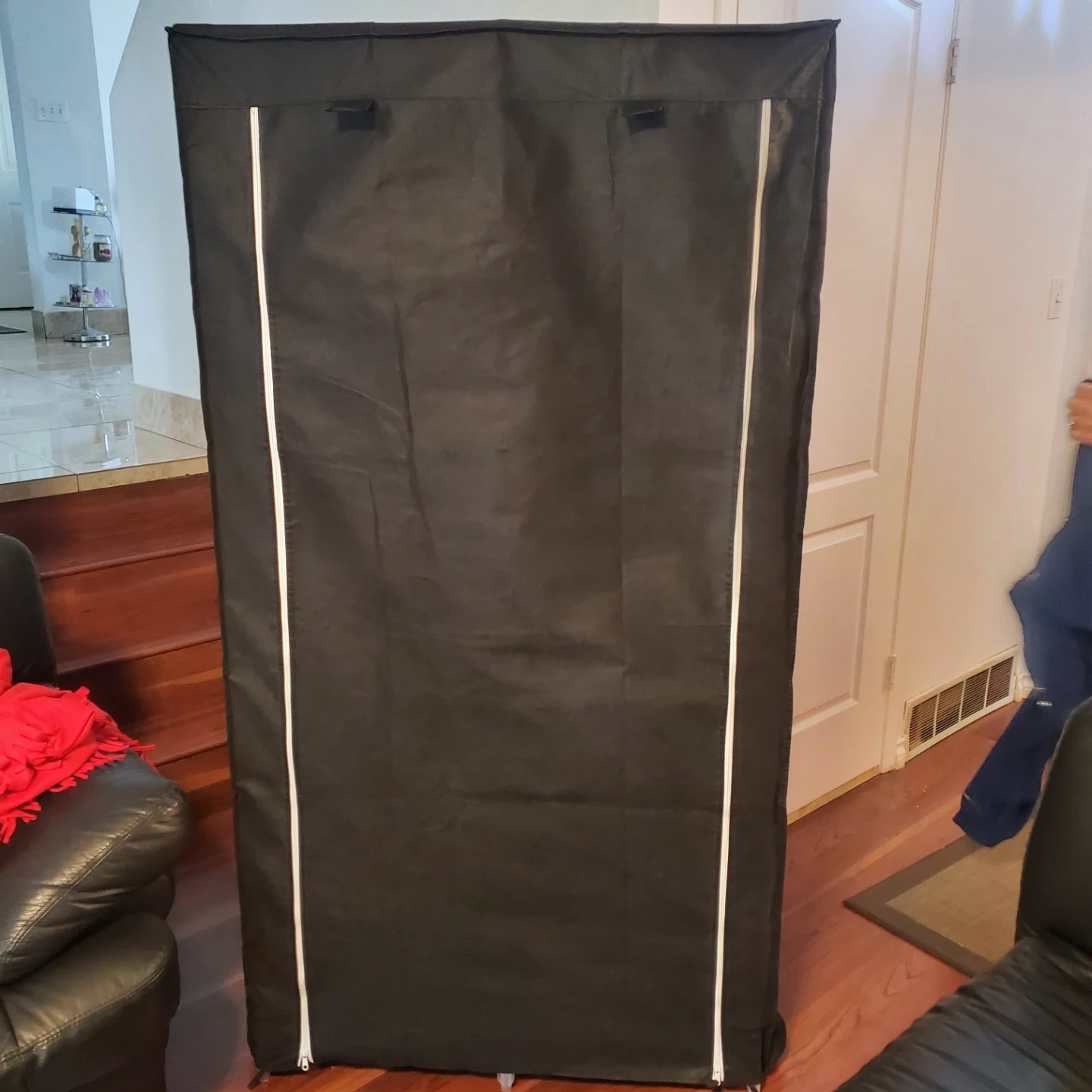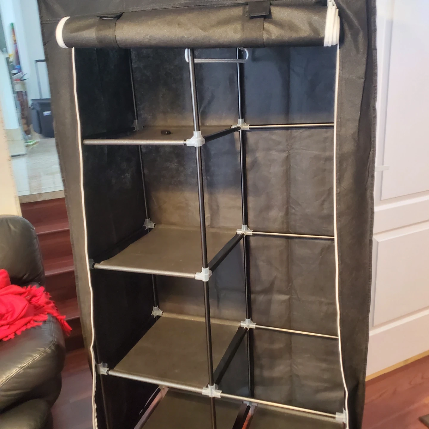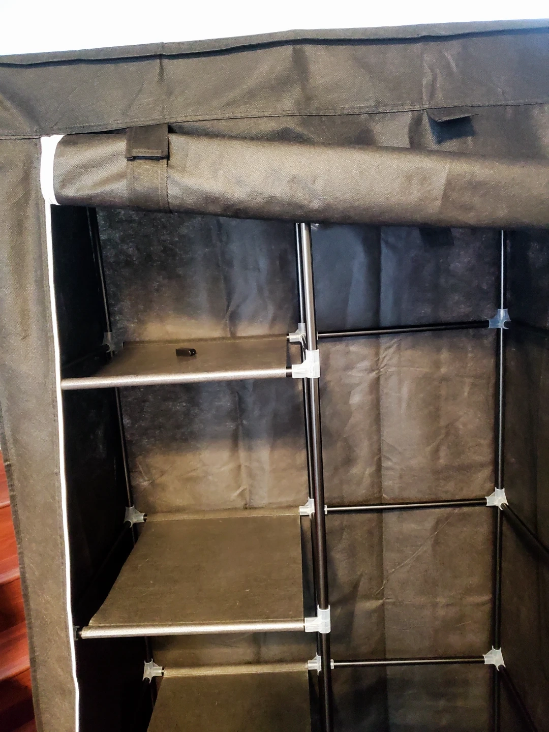 This portable wardrobe features a black fabric cover and multiple shelves for storage. It includes a hanging rod for clothes. Easy to assemble