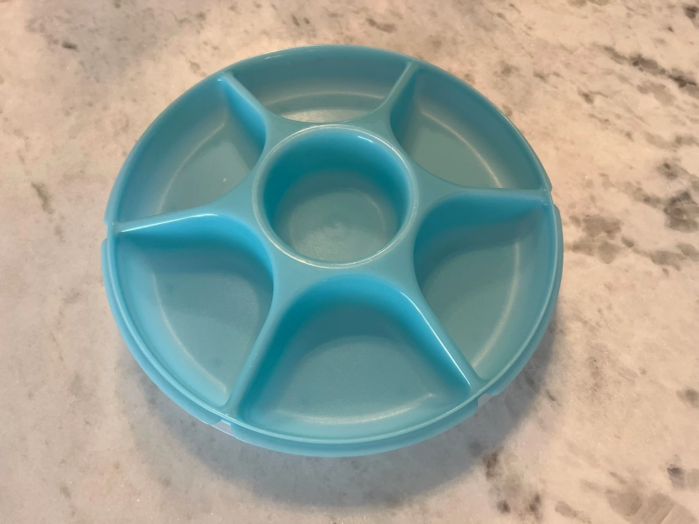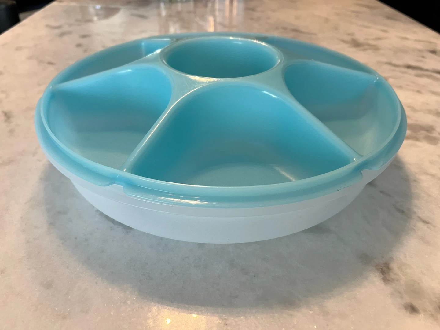 Blue and white plastic serving tray with five sections and a centre compartment. Lid included.