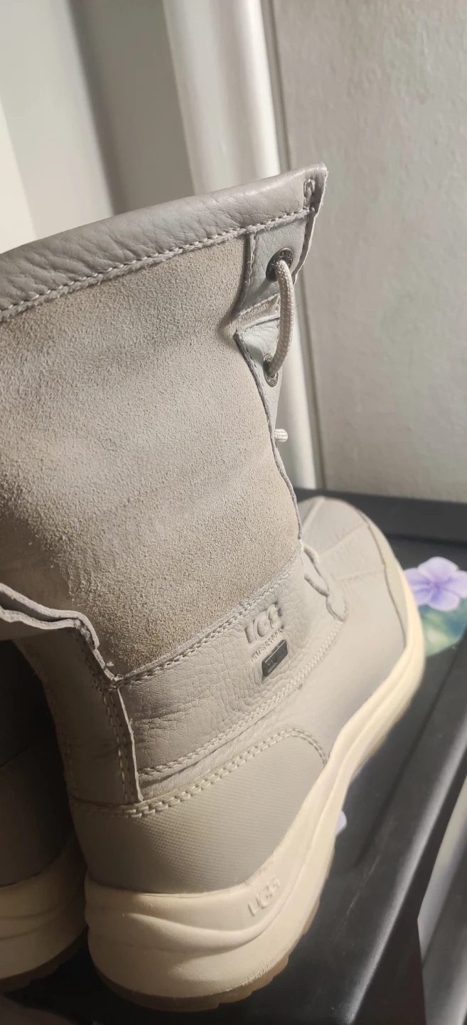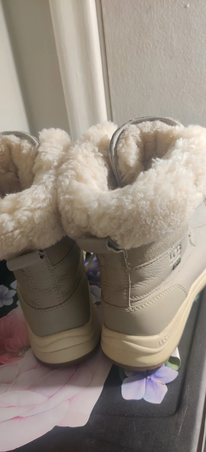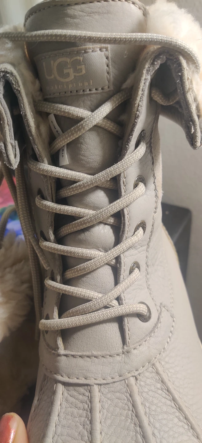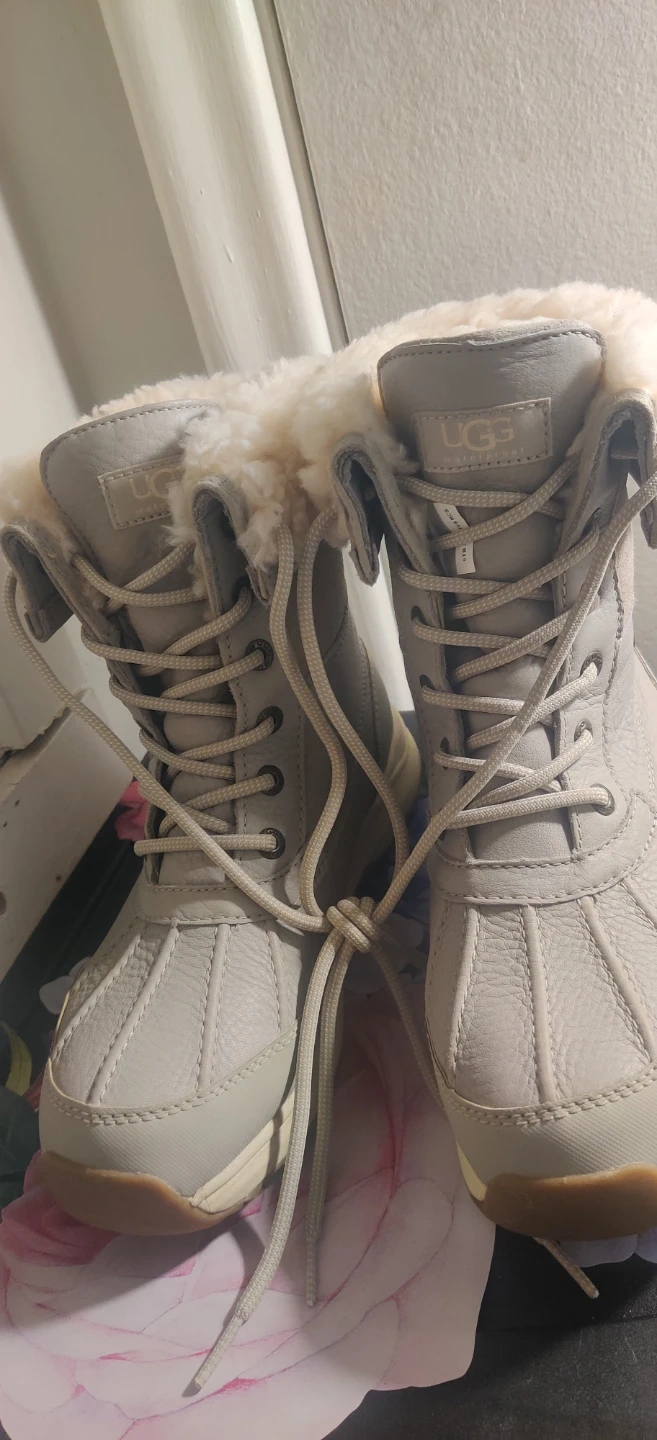 These UGG boots are designed for cold weather, featuring a waterproof exterior and warm lining. They're a size 7.5 with laces for a secure fit. Perfect for staying cozy and dry during winter!Boots are pre-owned so minor sign of wear should be expected