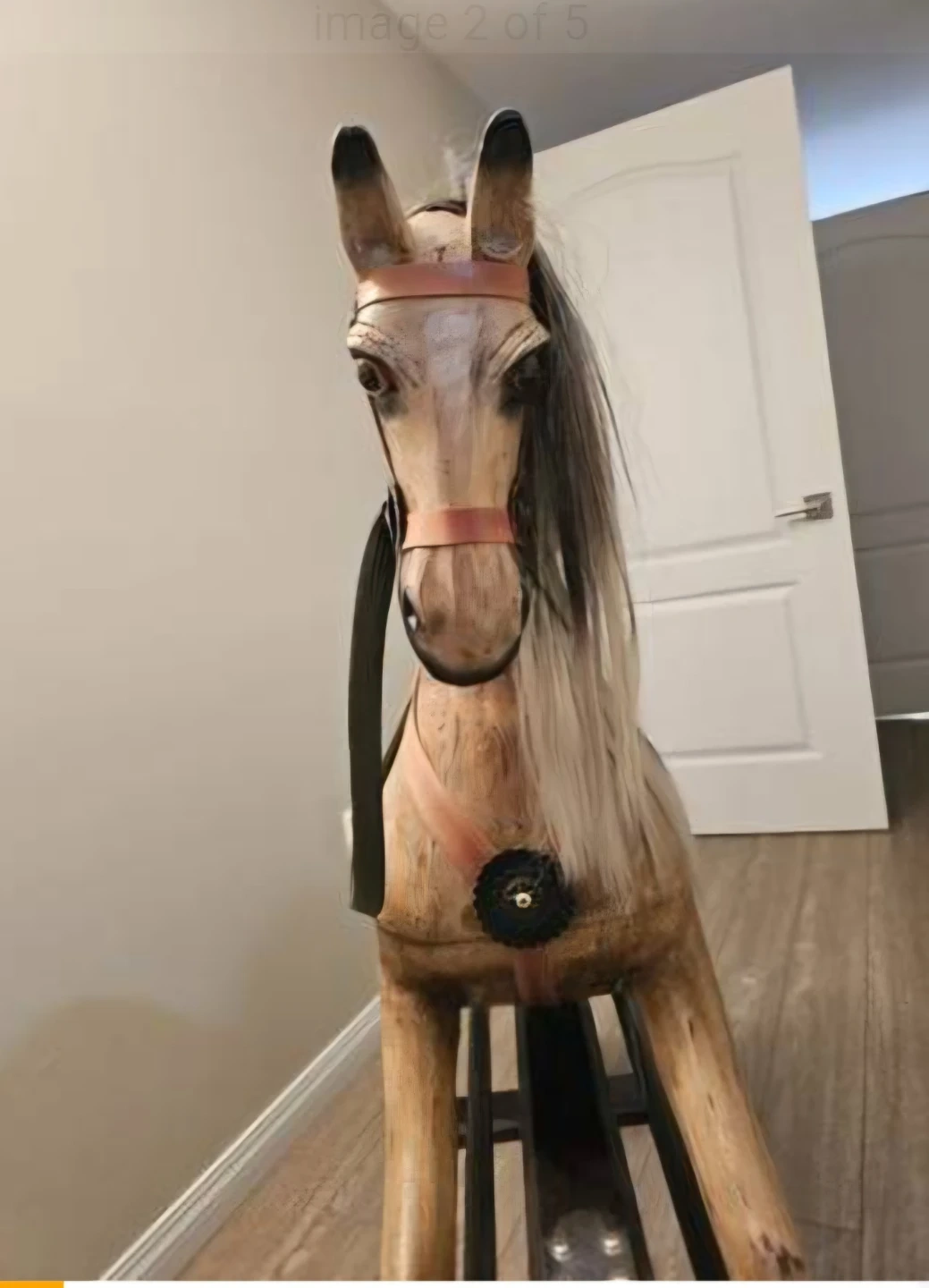 A classic wooden rocking horse with a vintage look. It features a brown leather-like saddle and reins. This horse is perfect for little ones to enjoy imaginative play or just for decor.