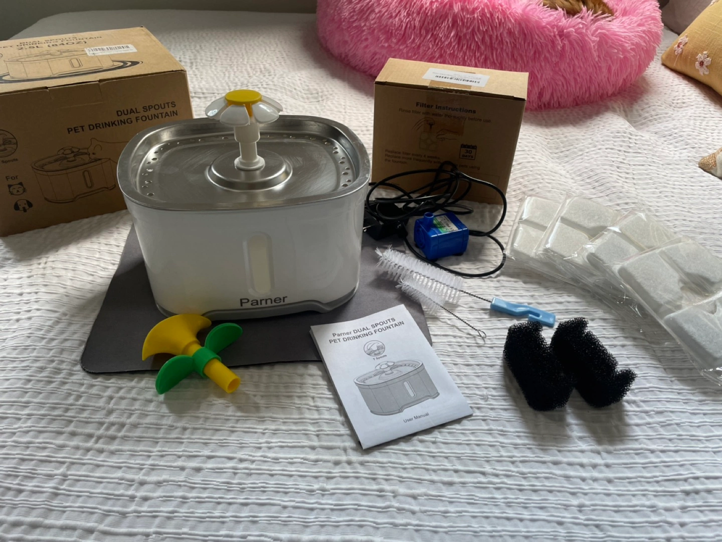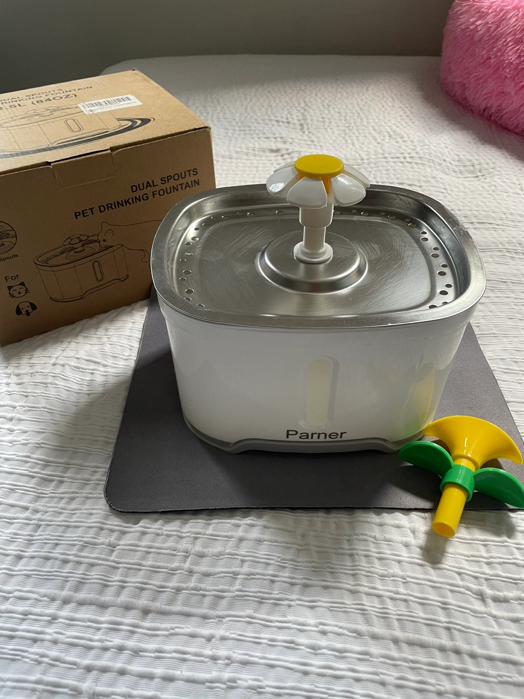 Excellent condition pet water fountain! The brand is Parner and it was originally bought on Amazon. It still works perfectly, I just upgraded to a new one. I used it for my cat for two years with zero issues!
