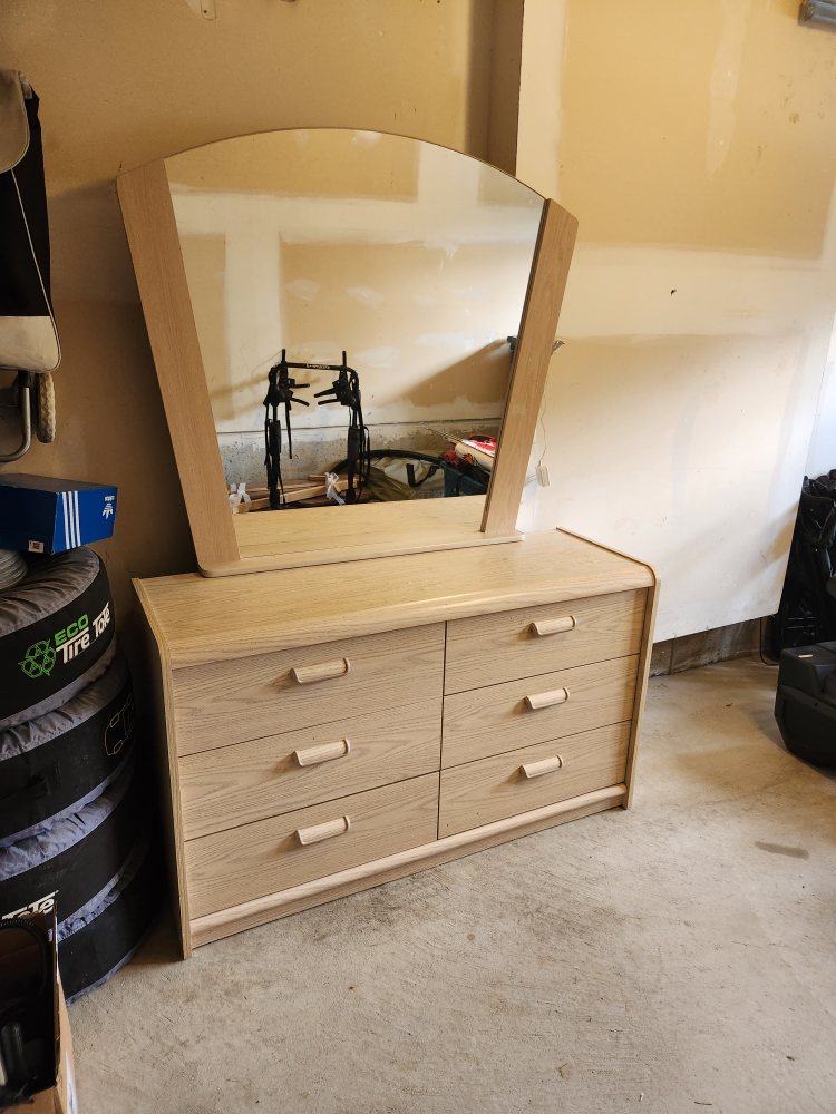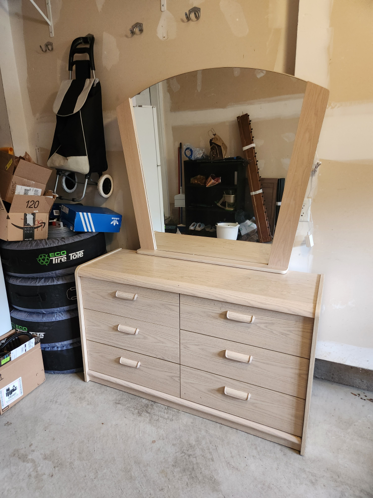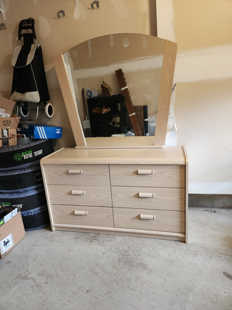 Wooden dresser with a mirror for sale in Mississauga -good condition, the mirror just needs to be screwed back into place -dimensions for dresser: 50x17x30 -dimensions for mirror: 40x37 -cash or e-transfer accepted (*NO LINKS*, ONLY THROUGH EMAIL OR PHONE) -come to my location for pickup *Don't ask for delivery, I will not deliver this*