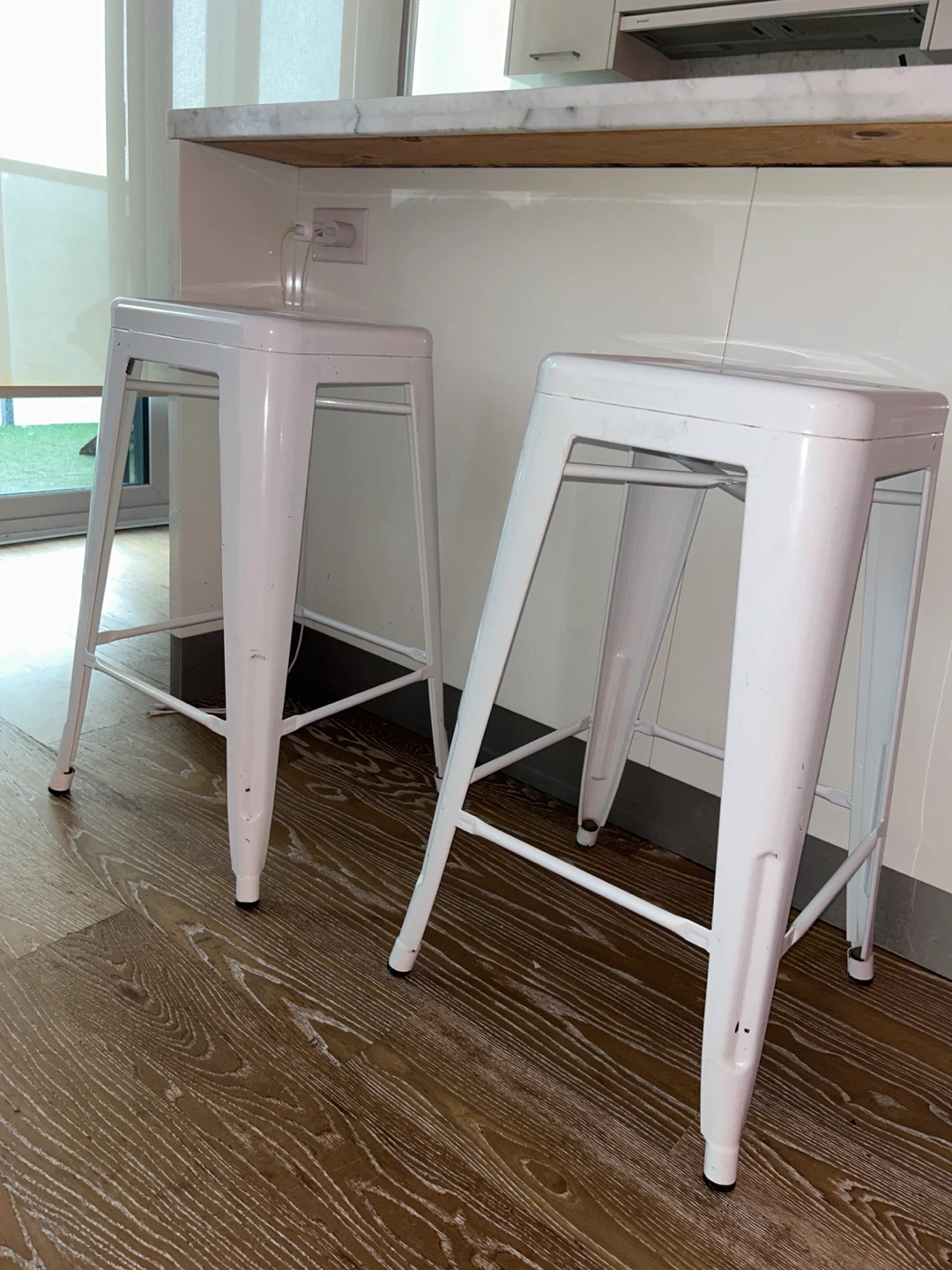 Selling a set of four white metal bar stools. These stools are made of durable metal and have a sleek, modern design. They're perfect for a kitchen island or home bar area. The simple design makes them easy to clean and maintain.