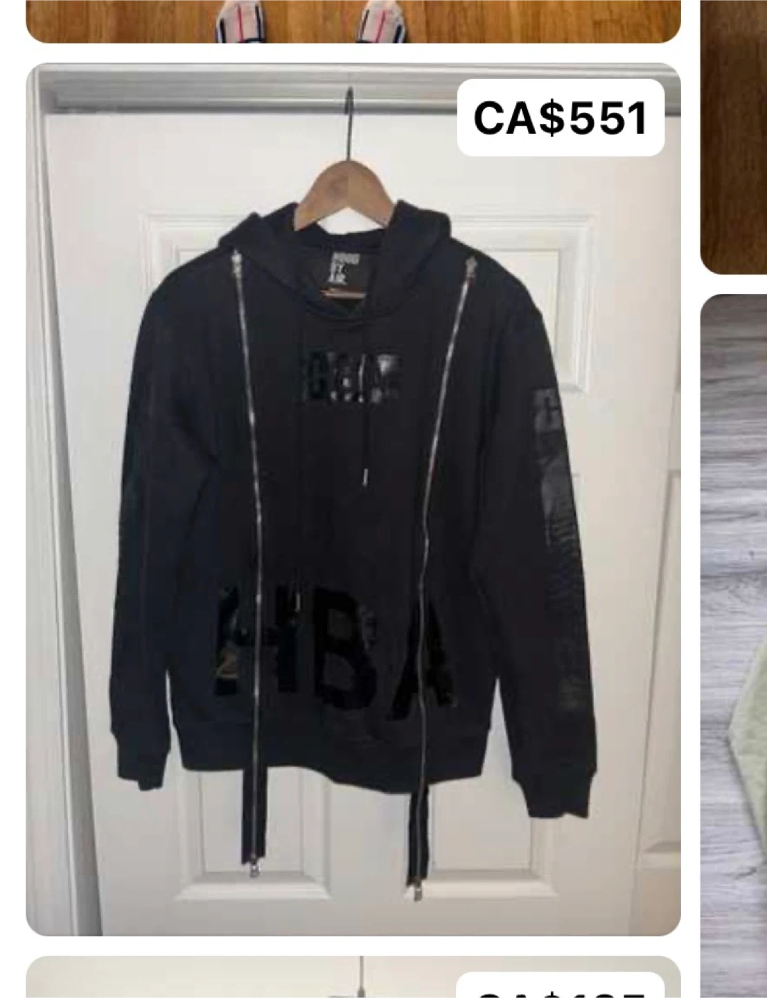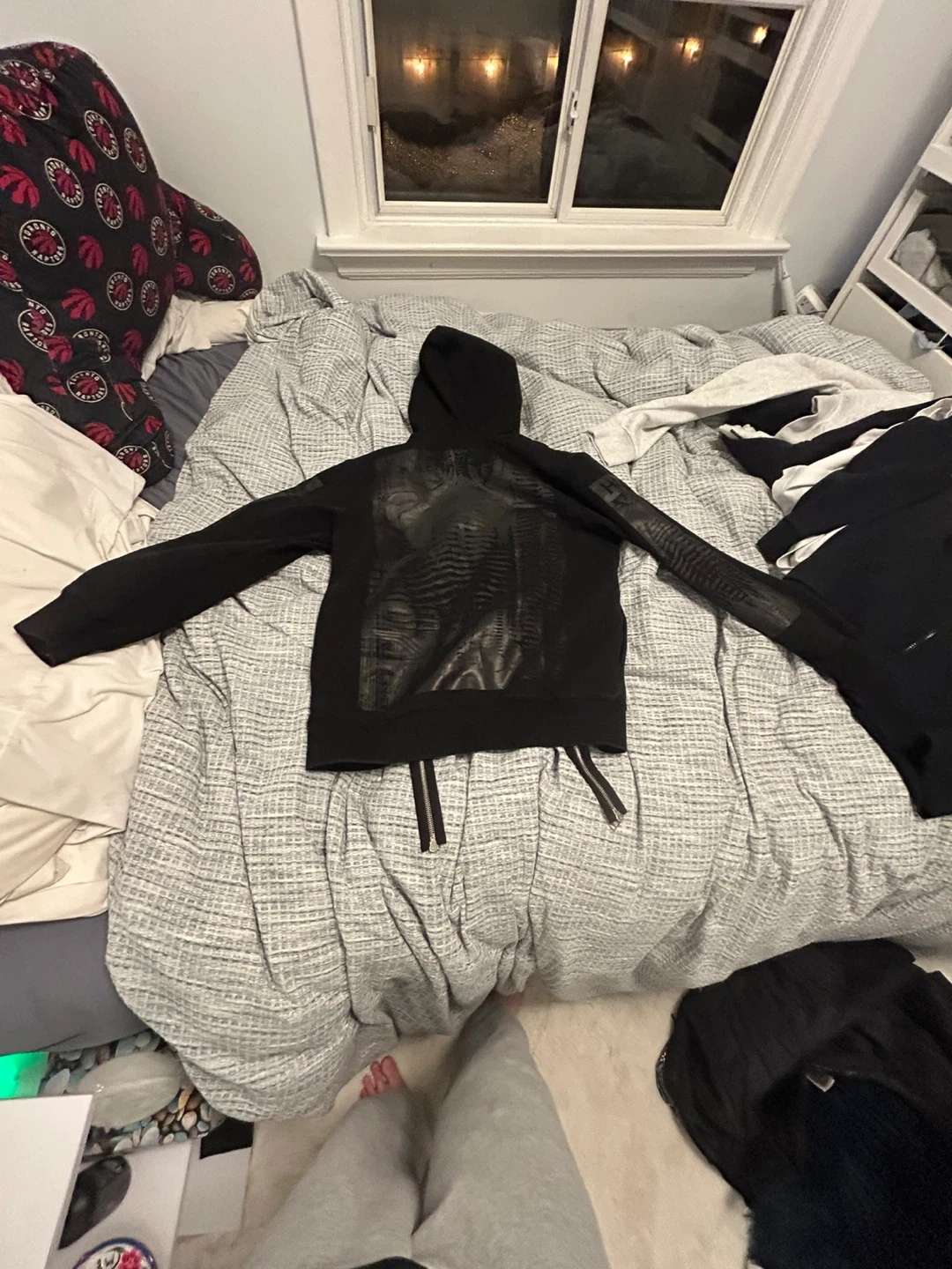 This black double zip-up hoodie features a unique graphic design on the front and a comfortable hood. It's made of a soft fabric blend. This hoodie is great for casual wear.