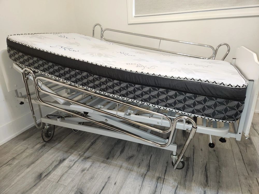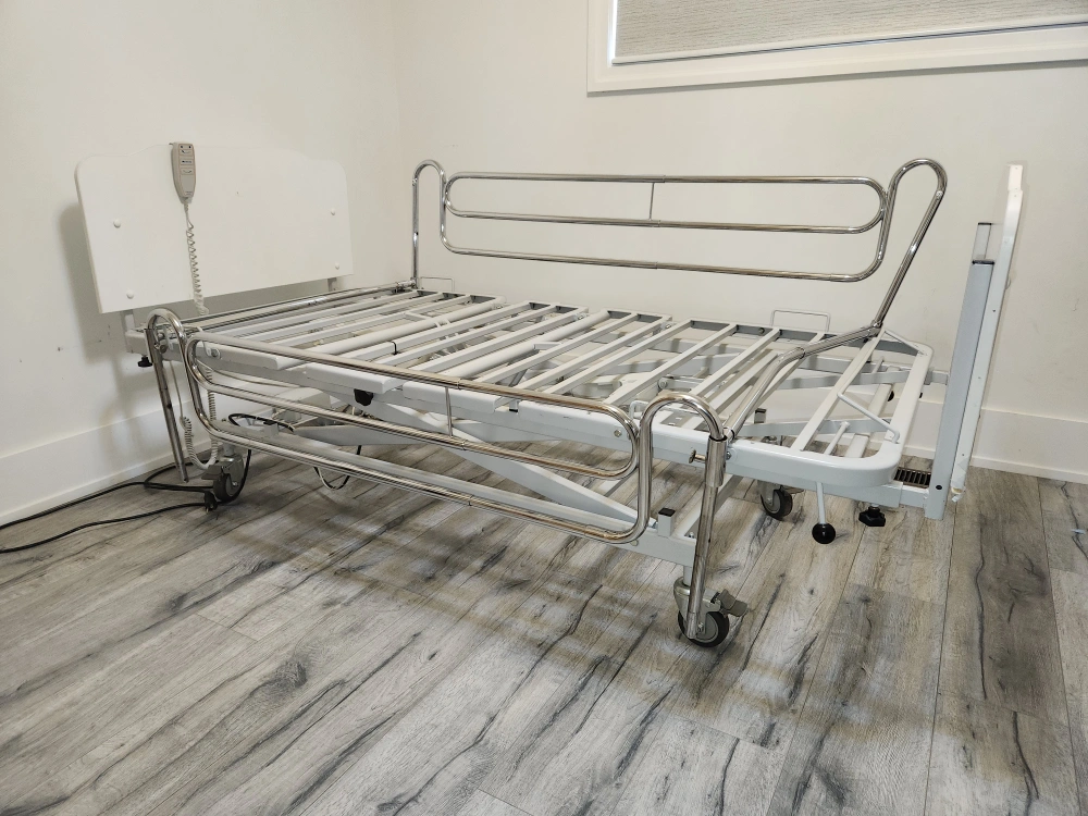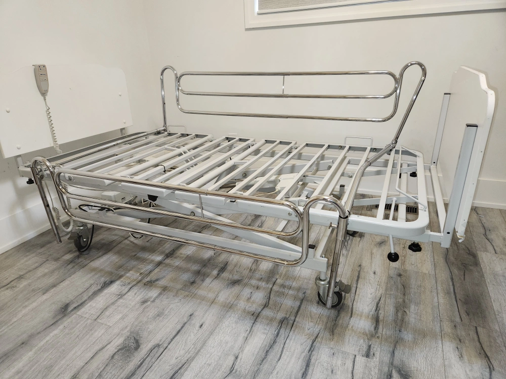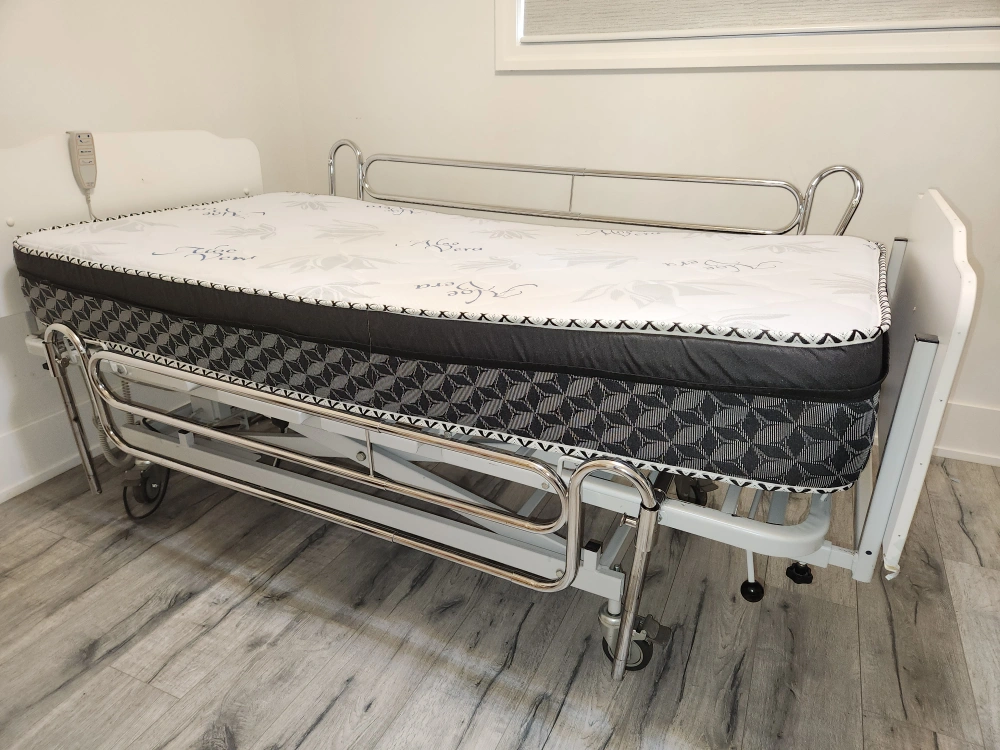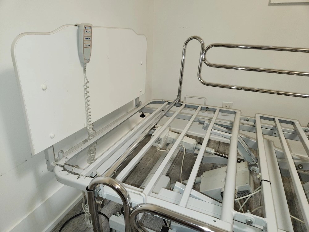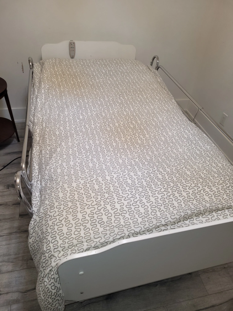 Bed is designed to ensure ease of use and maintenance. Great autonomy for users, home support, and high quality are some of the best features. Head, middle, and foot adjustable positions. Raise and lower the entire bed for ease transfers and minimize falls. Wheels with lock, attached remote control, and removable side rails. Please see all the pictures Very good condition. Smoke-free home. Available for pickup near Martin Grove and Westway.