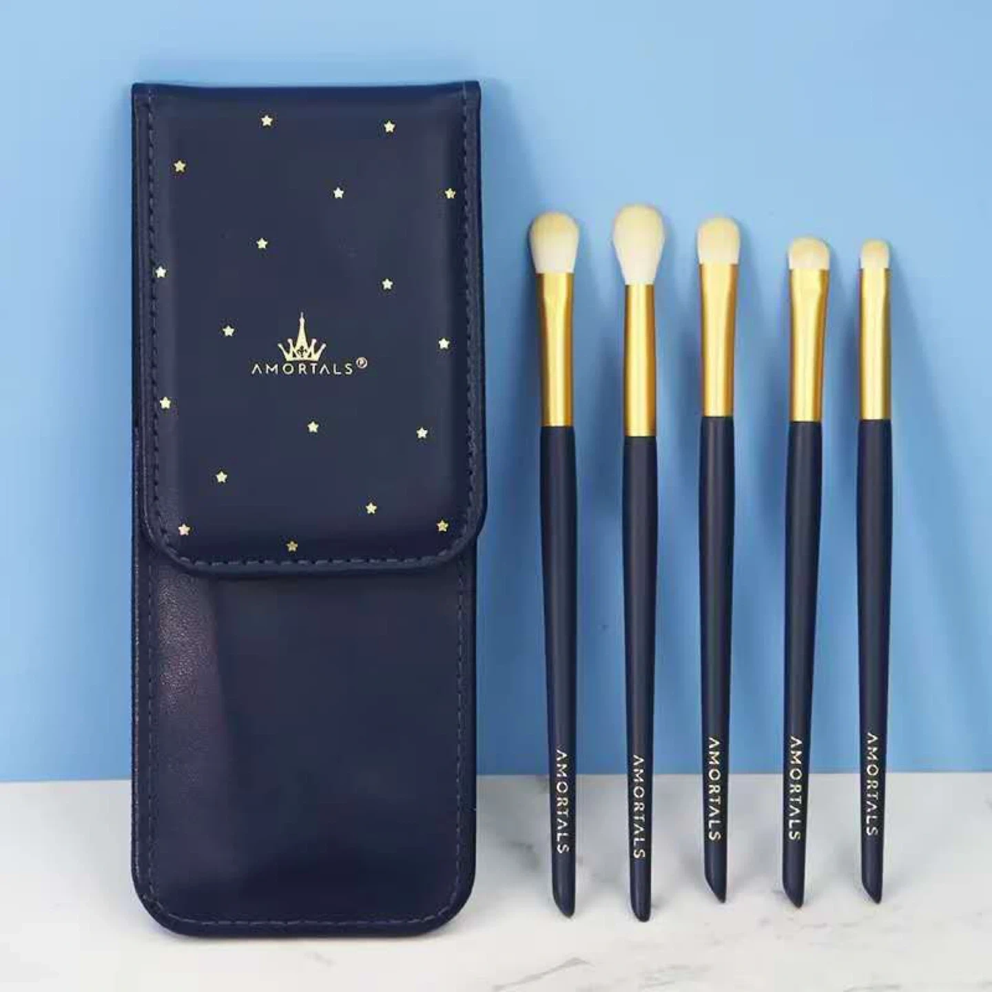 A set of five Amortals makeup brushes and a navy blue starry case. These brushes have dark handles and gold accents. Great for eyeshadow application!