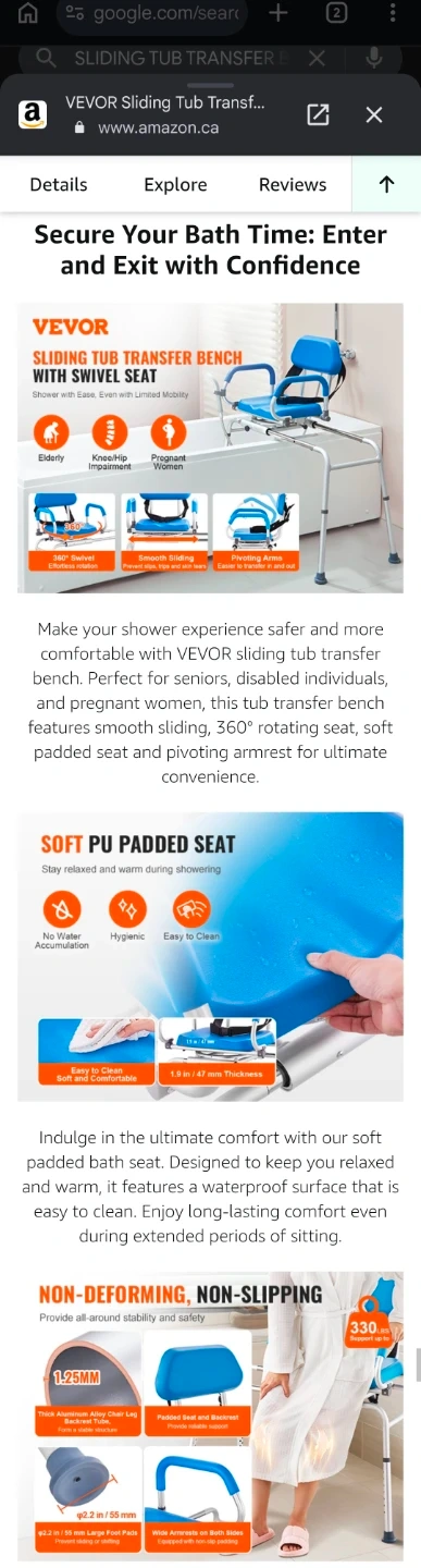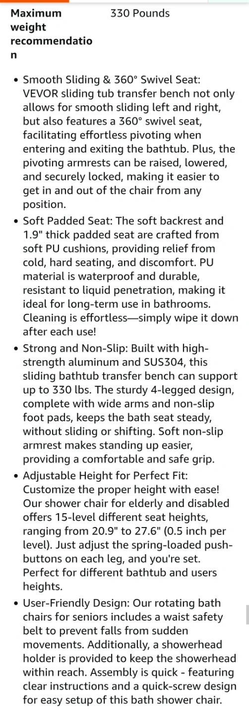 I'm selling a VEVOR sliding tub transfer bench, perfect for anyone needing assistance getting in and out of the bathtub. This new bench features a 360-degree swivel seat, sliding shower chair, pivoting armrest, and padded seat with safety belt and adjustable height, supporting up to 330lbs.