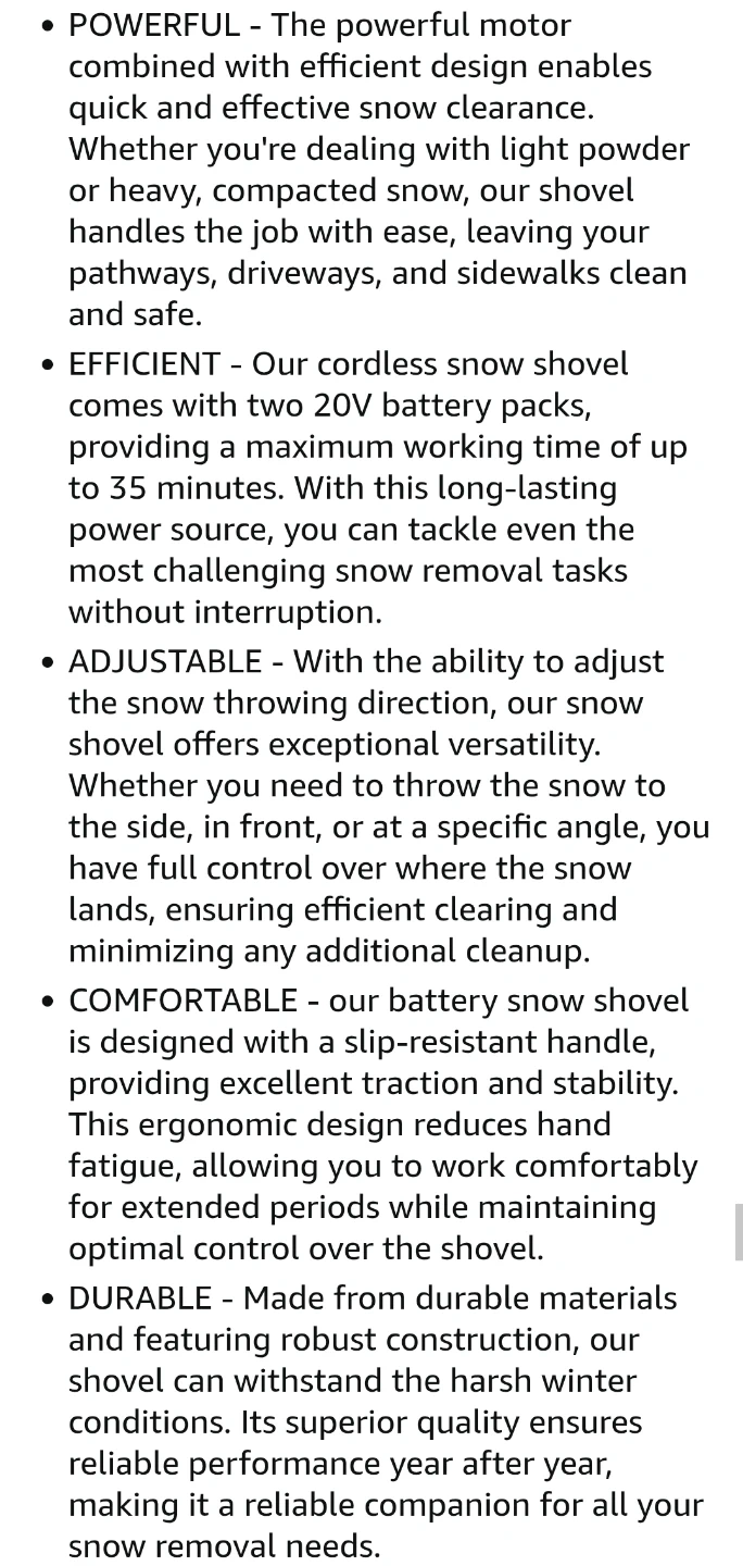 * Cordless snow shovel comes with two 20V battery packs, providing a maximum working time of up to 35 minutes
