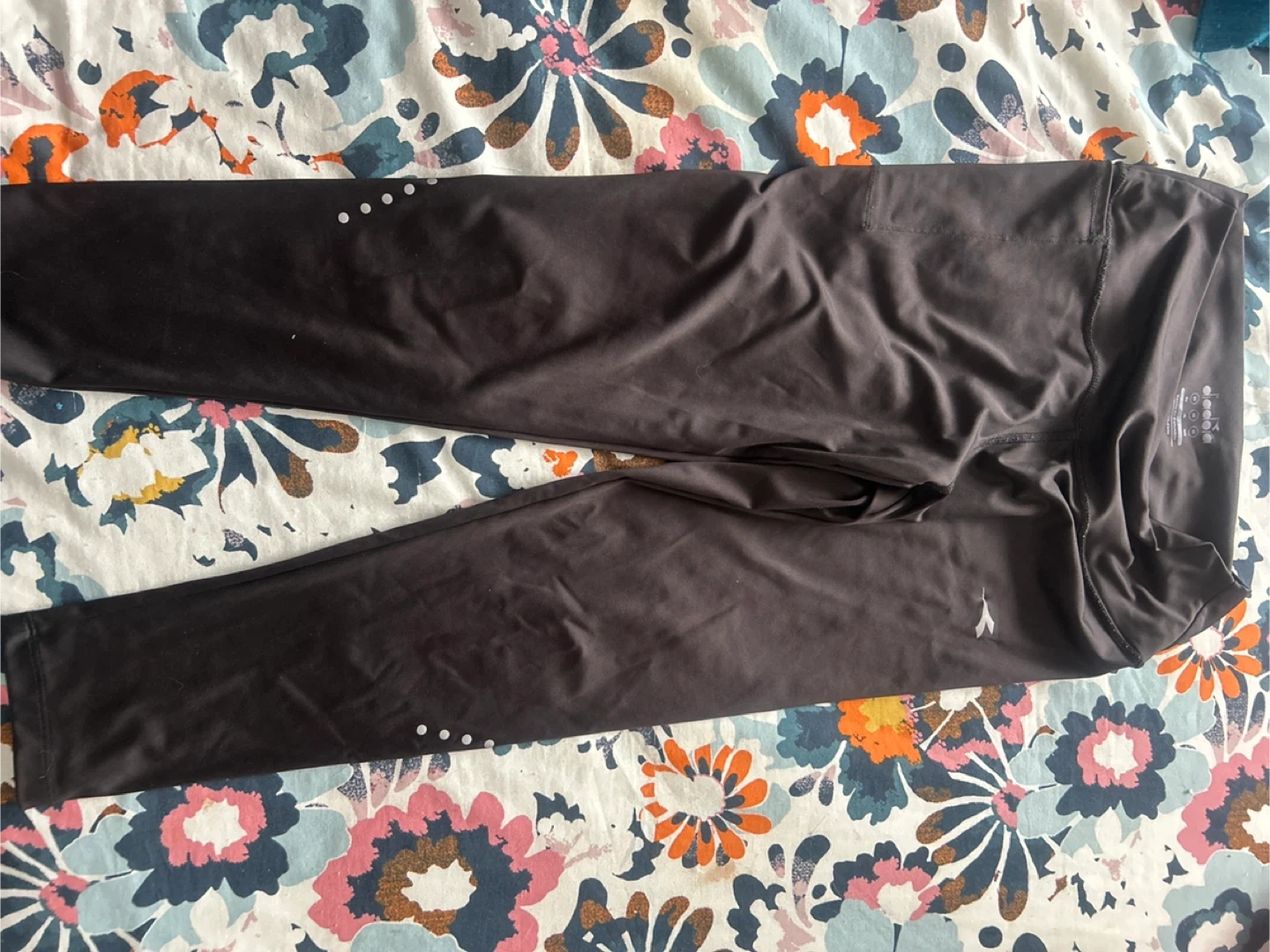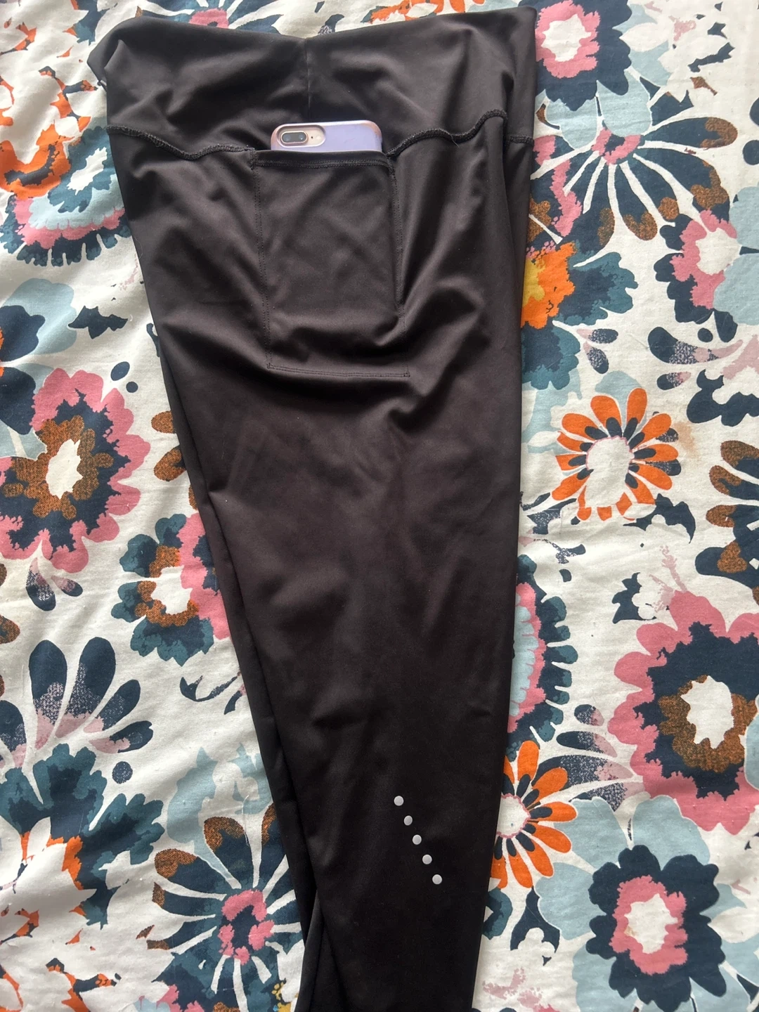 These black Diadora running leggings are designed for comfort and convenience. They feature a pocket on the side, perfect for carrying your phone. Reflective dots are visible on the lower leg for added visibility.