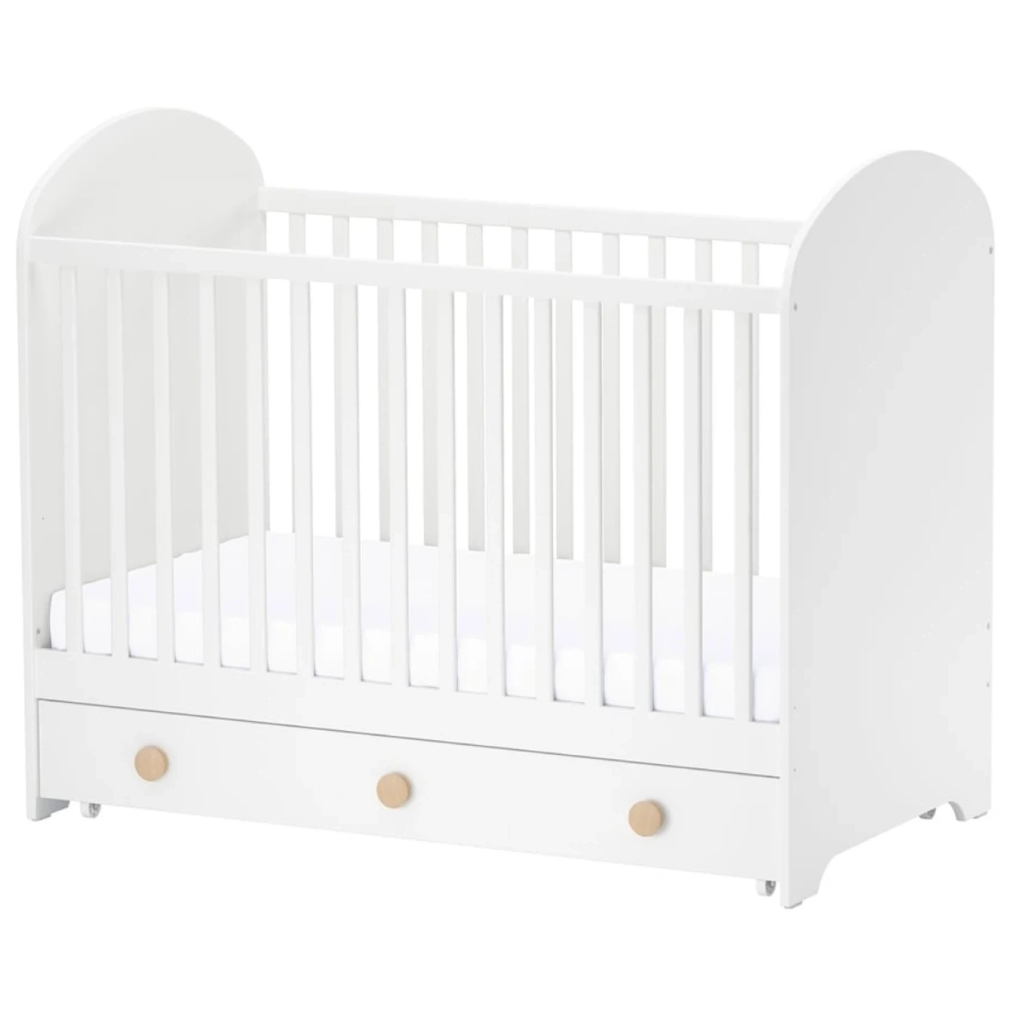 A white baby crib with a built-in drawer for storage. It's made of wood. This crib is 146 cm long and 57.5 inches wide. It's suitable for newborns and young children.