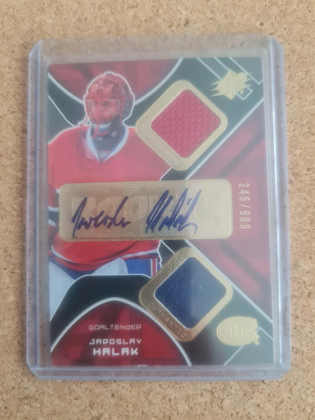 An Upper Deck authentic autographed trading card featuring goaltender Jaroslav Halak. It includes swatch pieces and is numbered 245 out of 999. This card is a great collectible for hockey fans!