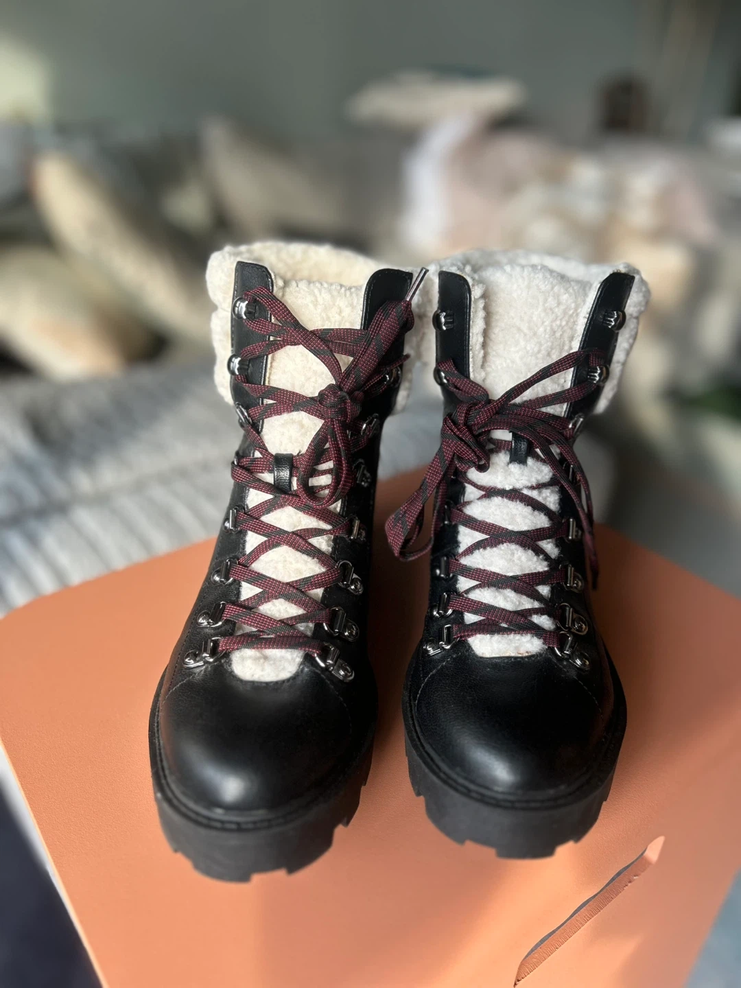 These Nine West winter boots are black with cozy sherpa lining. They feature a durable lug sole for traction and a lace-up closure. Perfect for staying warm and stylish during colder months!