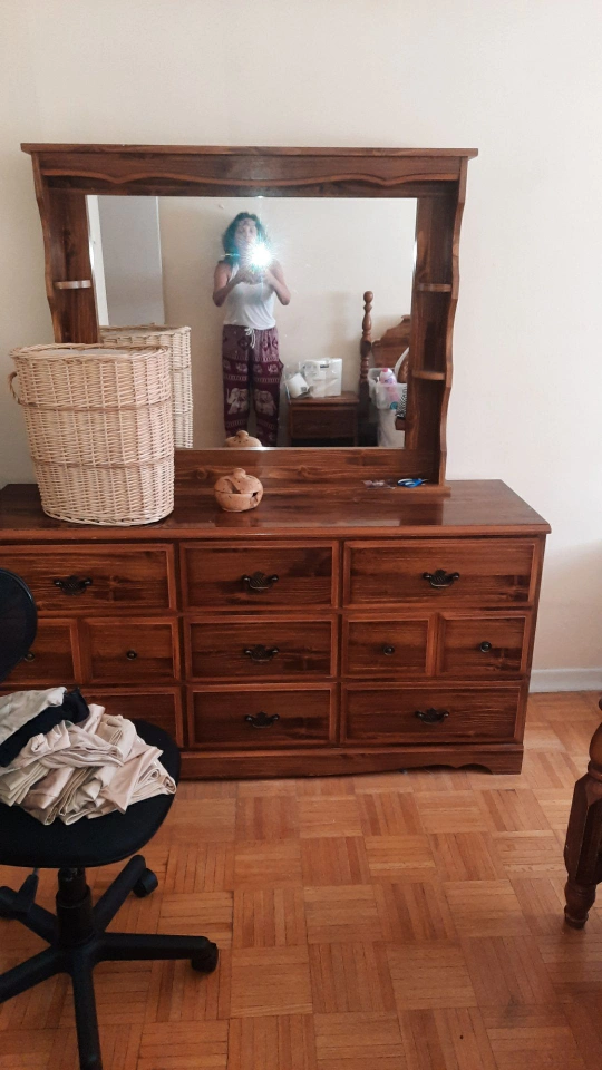 Moving sale. Bedroom furniture as seen in the pic. Ask about the lamps and the bedside tables. Everything must go fast! No delivery, pick up only. Can remove the mirror and the drawers for easy transportation. Nine drawers.
