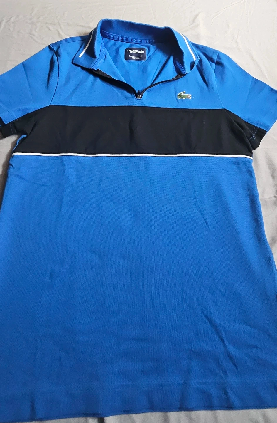 A blue and black Lacoste Sport polo shirt. It's a size US S and made in China. This short-sleeve polo has a quarter-zip closure. It's made from a breathable fabric.