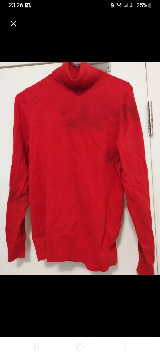 This Andrew Marc brand red turtleneck sweater top is used, and it looks like the color has bled in some patches that are darker, but the material is good - 70% cotton. It is medium size.
