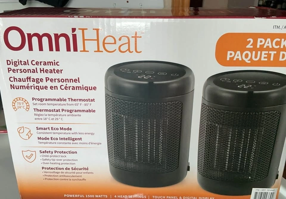 New in box, touch control panel and digital display make adjustments a breeze. Programmable thermostat settings from 65°F–85°F, with a 12-hour timer for ultimate flexibility. 4 heat settings (Low, Medium, High, and Eco Mode) for personalized comfort. Smart Eco Mode automatically optimizes energy use. Child-lock feature provides added peace of mind, with tip-over and overheat protection for worry-free use. Hideaway cord wrap keeps things organized, while carrying handle and compact size make transport quick and easy. Ceramic heating elements provide consistent, even heat throughout your space. Powerful 1500-watt heating to fend off the chilliest temperatures. DC motor optimizes airflow for maximum efficiency, power savings, and reduced noise. Includes 2 personal heaters, enabling you to keep multiple areas warm and bring heat where you need it.