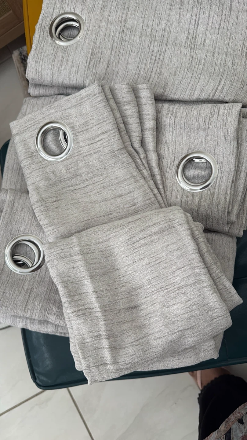 Set of three light grey eyelet curtains. They have a subtle textured pattern woven into the fabric. Includes silver-toned eyelets for hanging. These curtains would be useful for adding privacy and light control to a room.